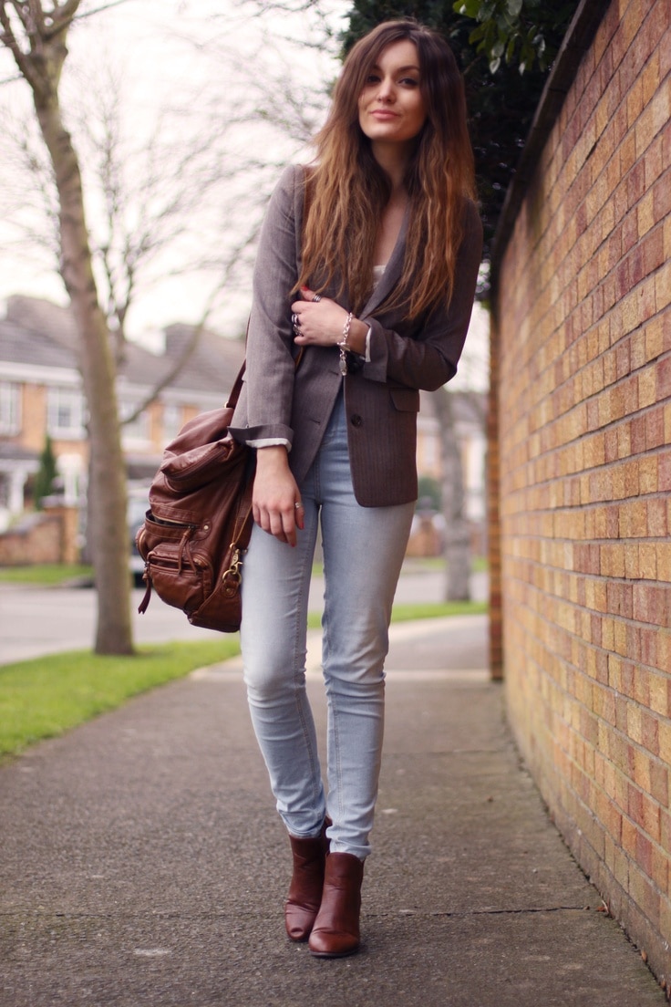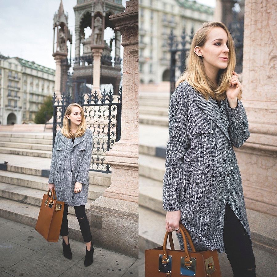 A brown rectangular bag will make a great addition to this outfit, such as a gray coat with black jeans and heeled ankle boots.