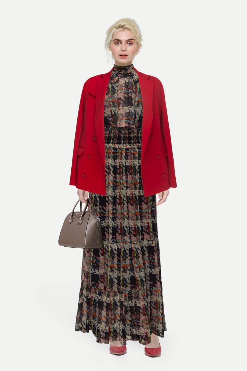 We get the original design by combining a long dress in a brown floor with a print and wearing a red jacket on top. Effectively complete the image of a red shoe and a small sand-colored bag.