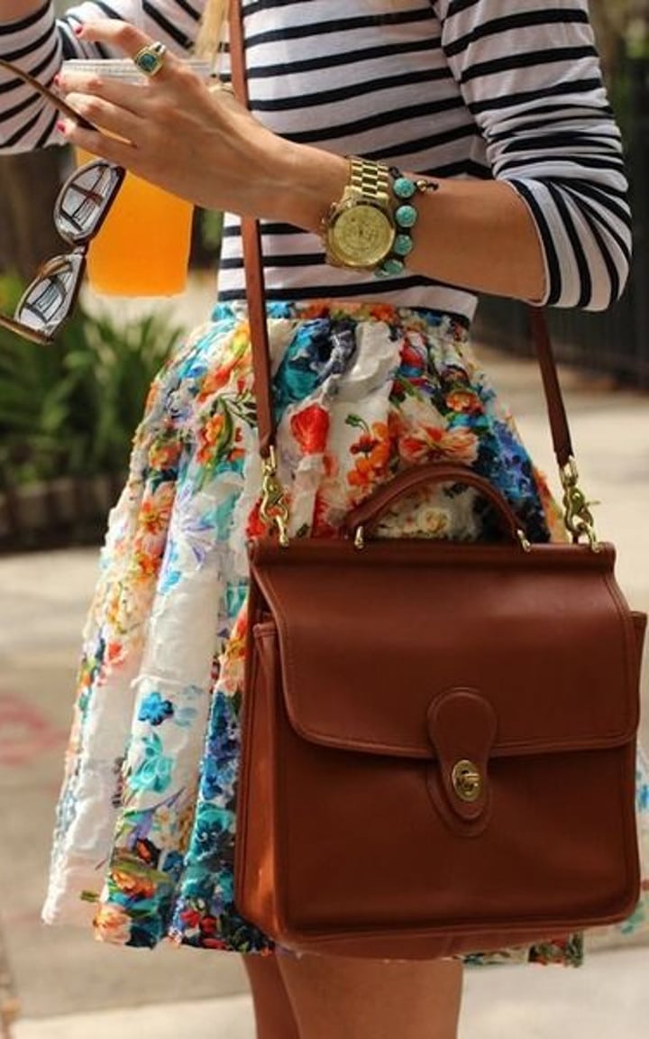And, wearing bright trousers or a skirt with floral motifs in combination with a light or dark top, a brown bag will perfectly complete your look.