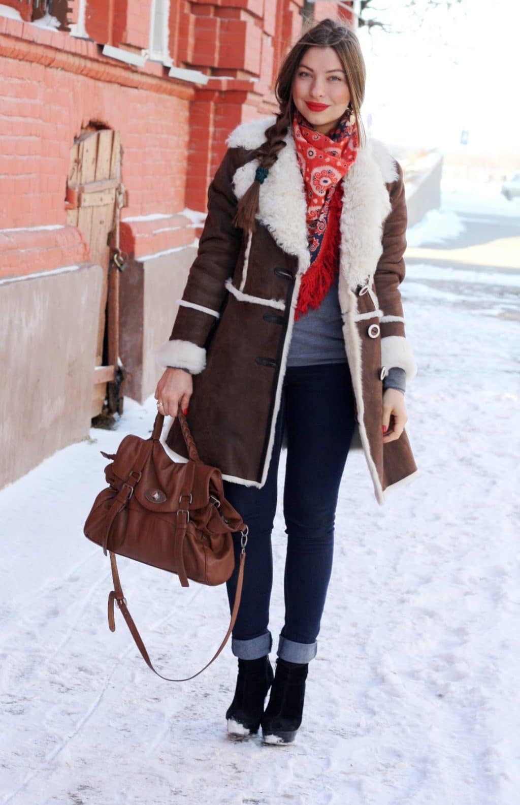 We will create an extravagant look with a combination of a brown handbag with a brown coat and a beige skirt with light boots.