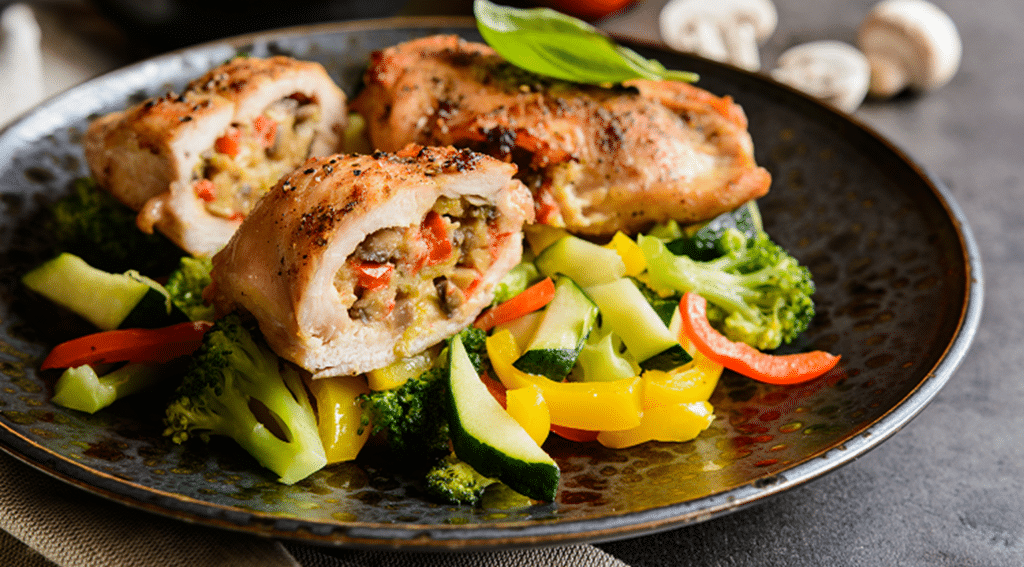 Break two eggs and roll the stuffed breast into them. First in the egg, and then in the breadcrumbs. We fry the meat in a skillet over medium heat. When the meat is ready, serve with mayonnaise and herbs.