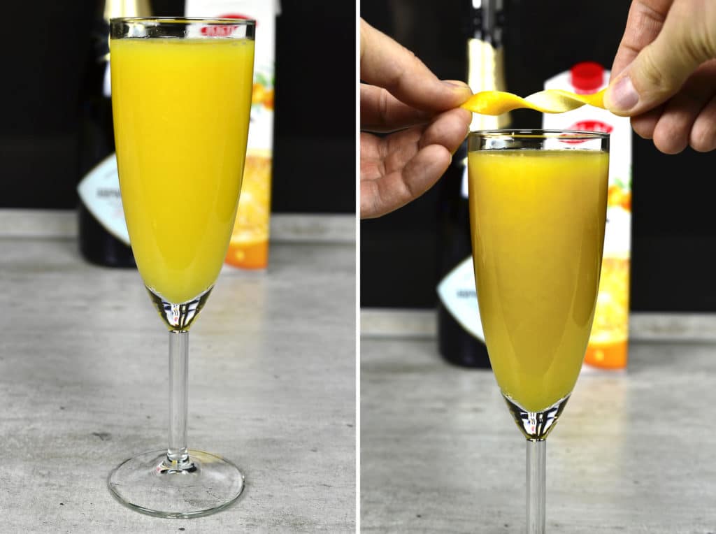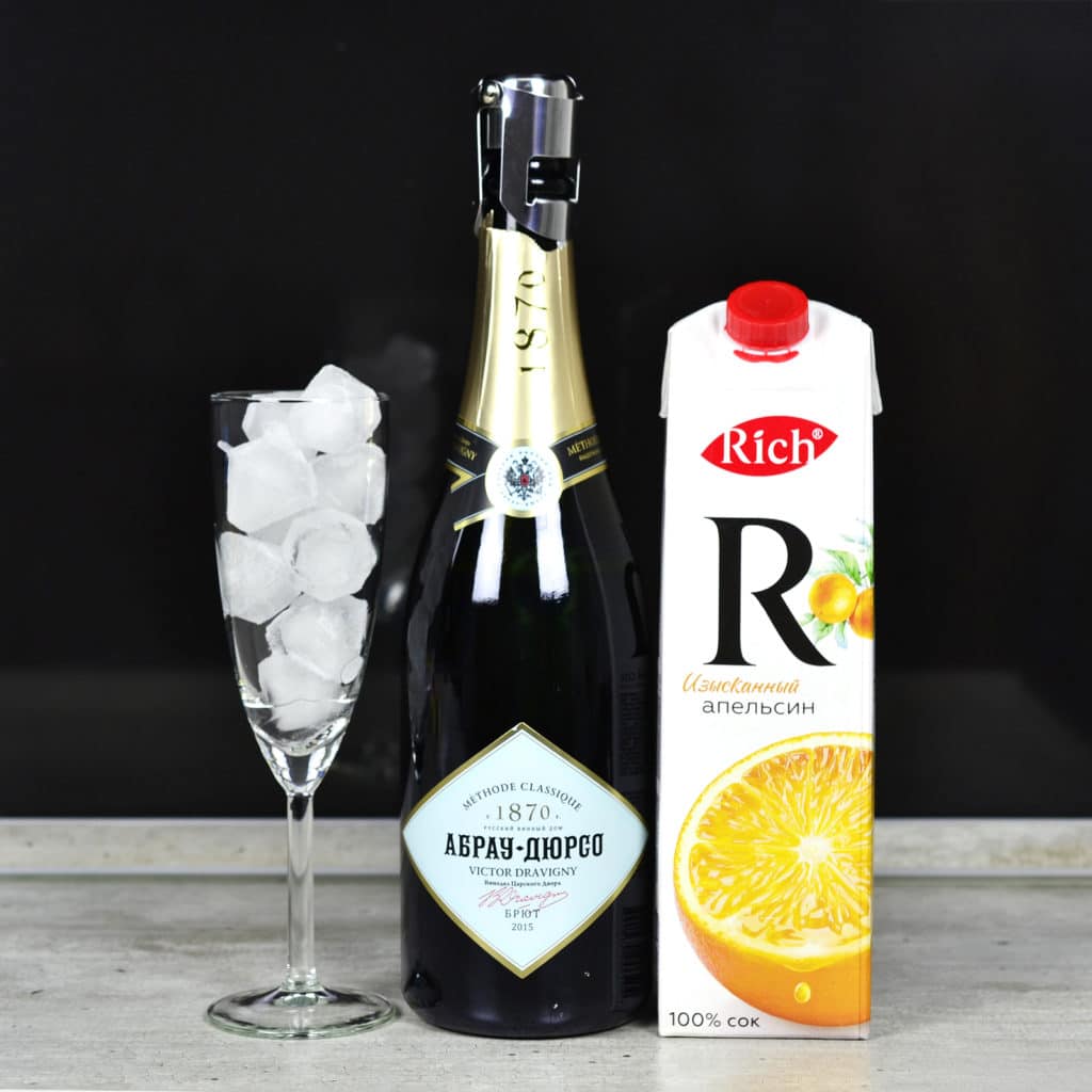 Pour 75 ml of orange juice and the same amount of champagne into a champagne glass. You can decorate the cocktail with an orange slice or lemon.