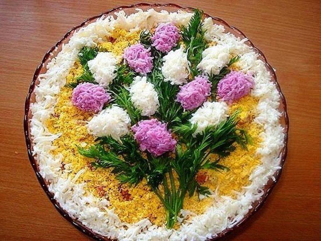 Lay out the salad in layers. The first chicken with mixed mayonnaise and grated garlic, the second mushrooms and mayonnaise, cucumber, pour grated cheese on top and cover with a thick layer of mayonnaise. After the mayonnaise, pour the grated yolk into the salad. For decoration with lilac flowers, egg white and tinted protein with beet juice are used.