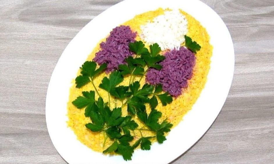 Boil the fillet and cut into small pieces. Cut the mushrooms into slices and fry in oil for 5-7 minutes until tender. Add the onions to the mushrooms, and fry them until the onions are ready. Boil the eggs and separate the whites from the yolks. Grate the protein on a coarse grater and drip beet juice on it, for color. We will decorate the salad with this protein.