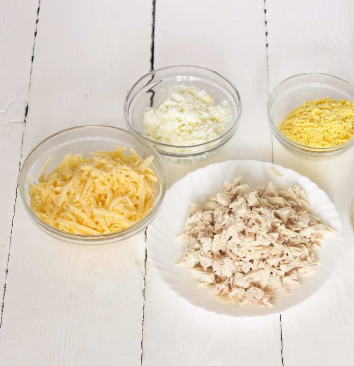 The cut should not be completely so that the cheese poured into it does not fall out from the back. After, we add grated cheese into the cut. When the breasts are stuffed with cheese, you close the incision with the help of skewers. Skewers must be wooden so that they can withstand the temperature of frying.