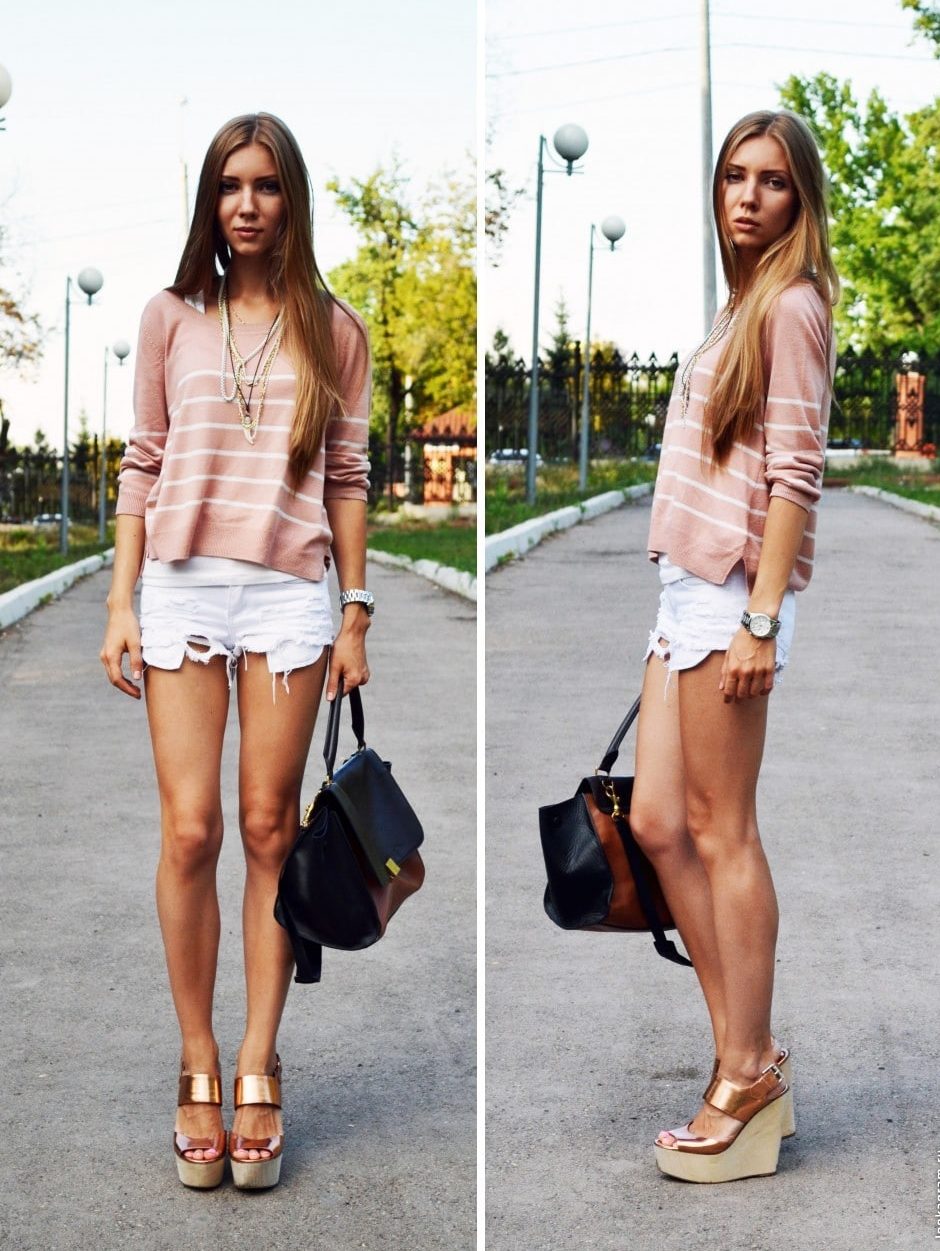 The jumper also fits perfectly with white shorts. This image is best used in spring with thin body tights and delicate shoes, for example, pastel-colored ballet shoes.