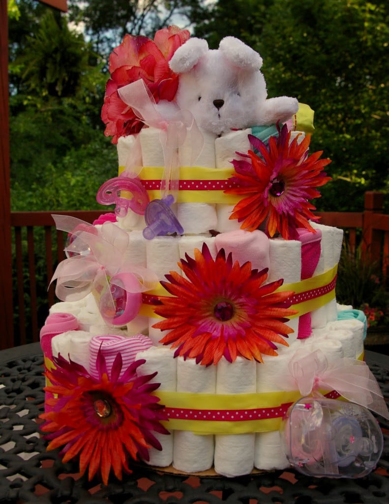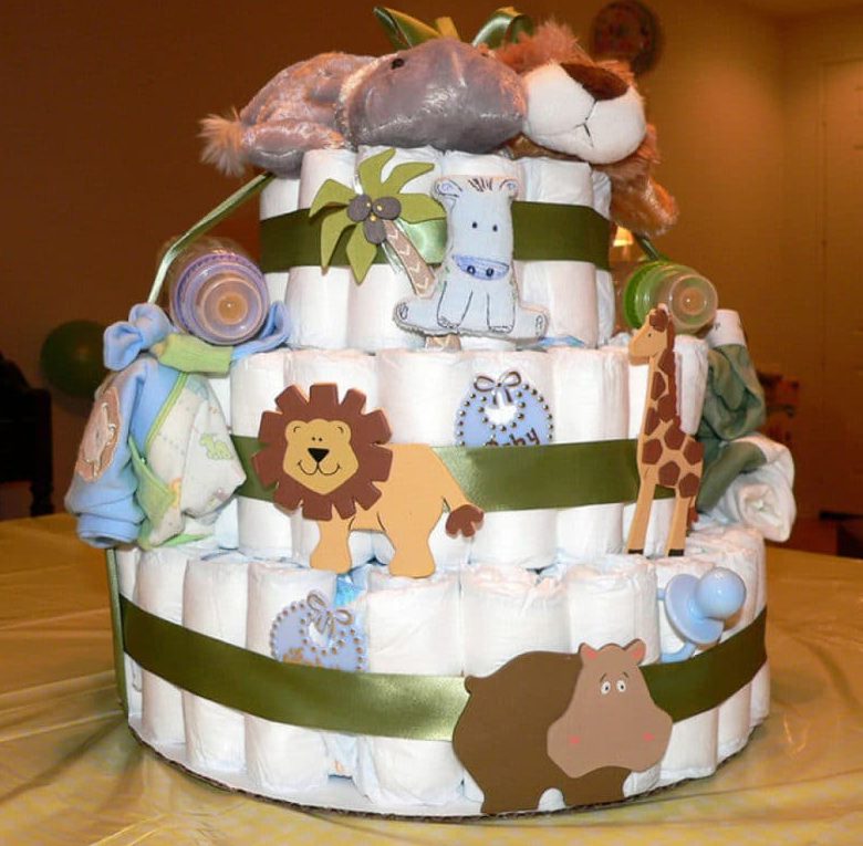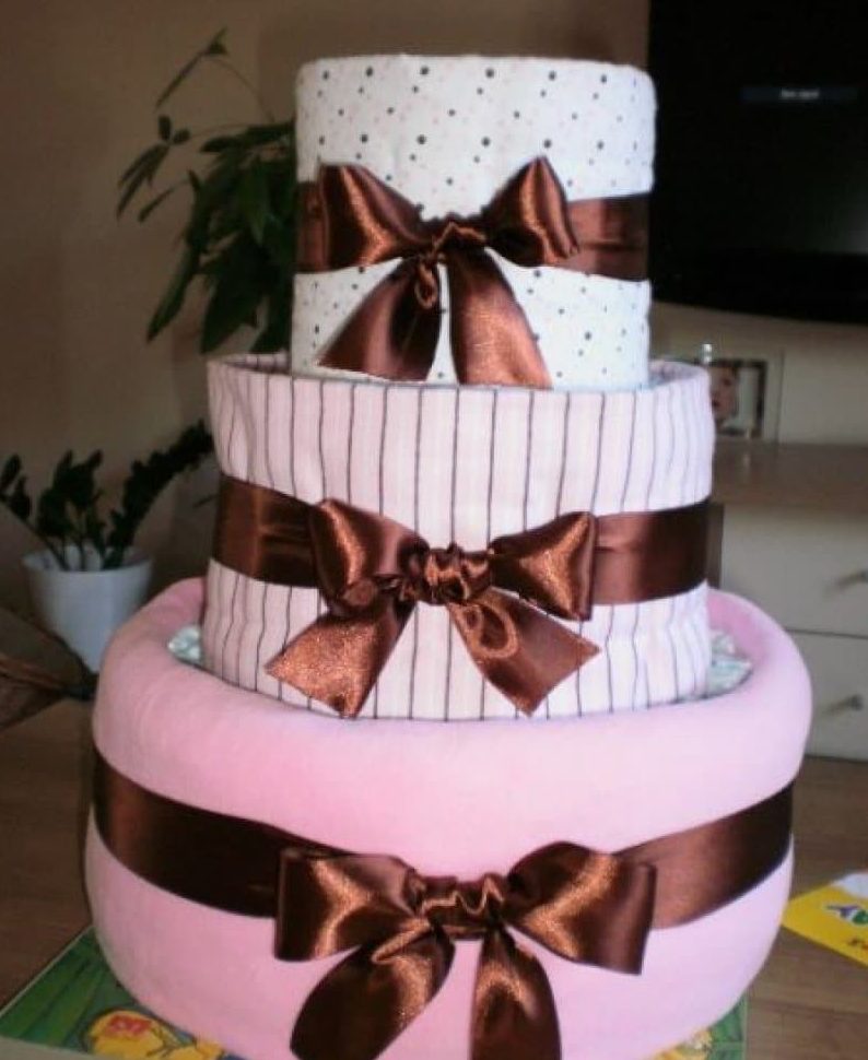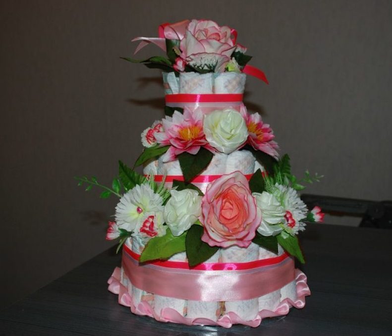 When the three tiers are finished, it is worth wrapping each of them with a wide ribbon and in the center of each tier, making a large bow. The top of the cake can be decorated to your taste. It can be a soft toy, a large decorative flower or a doll with the same bows as on the cake. In the cake itself, you can put a children's thermometer, bottles, nipples, as well as other small, children's accessories.