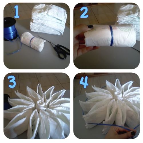 Take a diaper and twist it into a tube, as shown in the photo. Wrap it with an elastic band for money so that it does not fall apart. Remember that for the first tier, you need to spend more diapers. When deciding on the quantity, then collect your tubes in a circle and secure them with an elastic band.