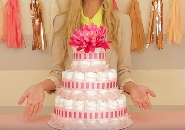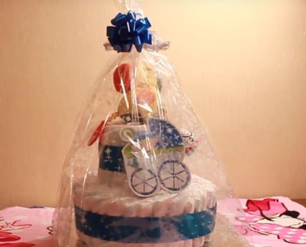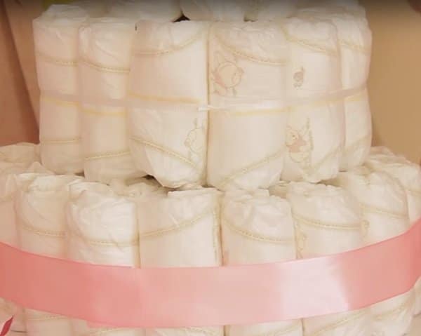 Take one diaper and roll it into a tube.Tie a tape around it, and place this diaper in the middle of the first tier on a cardboard base. Lay out each diaper around, slightly spreading its middle. Divide the diapers, letting 30 pieces fall on the first tier and leaving 15 on the second. Tie the first tier with tape, squeezing a little her diapers.