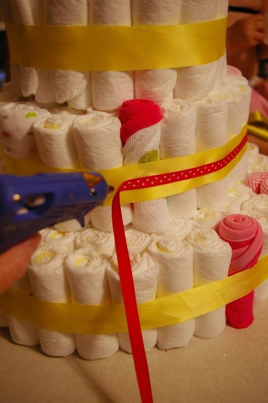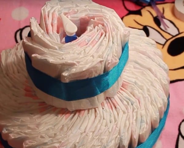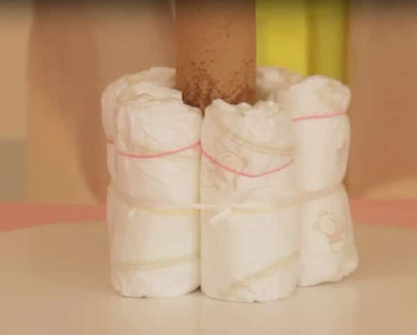 Continue to do the same with other diapers, only using a smaller quantity for each subsequent tier. Do not forget to fix each tier with an elastic band.