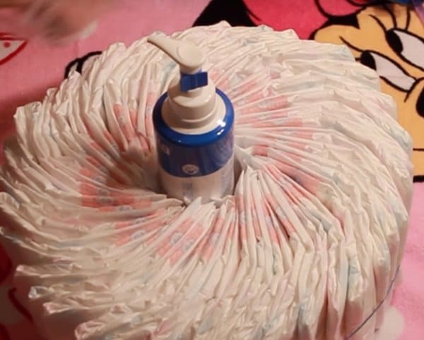 In the center on a cardboard base we put a bottle with baby cream, and around, as indicated in the photo, lay out our rolls. You can alternate diapers with body, booties or socks. We fix the entire tier with tape.