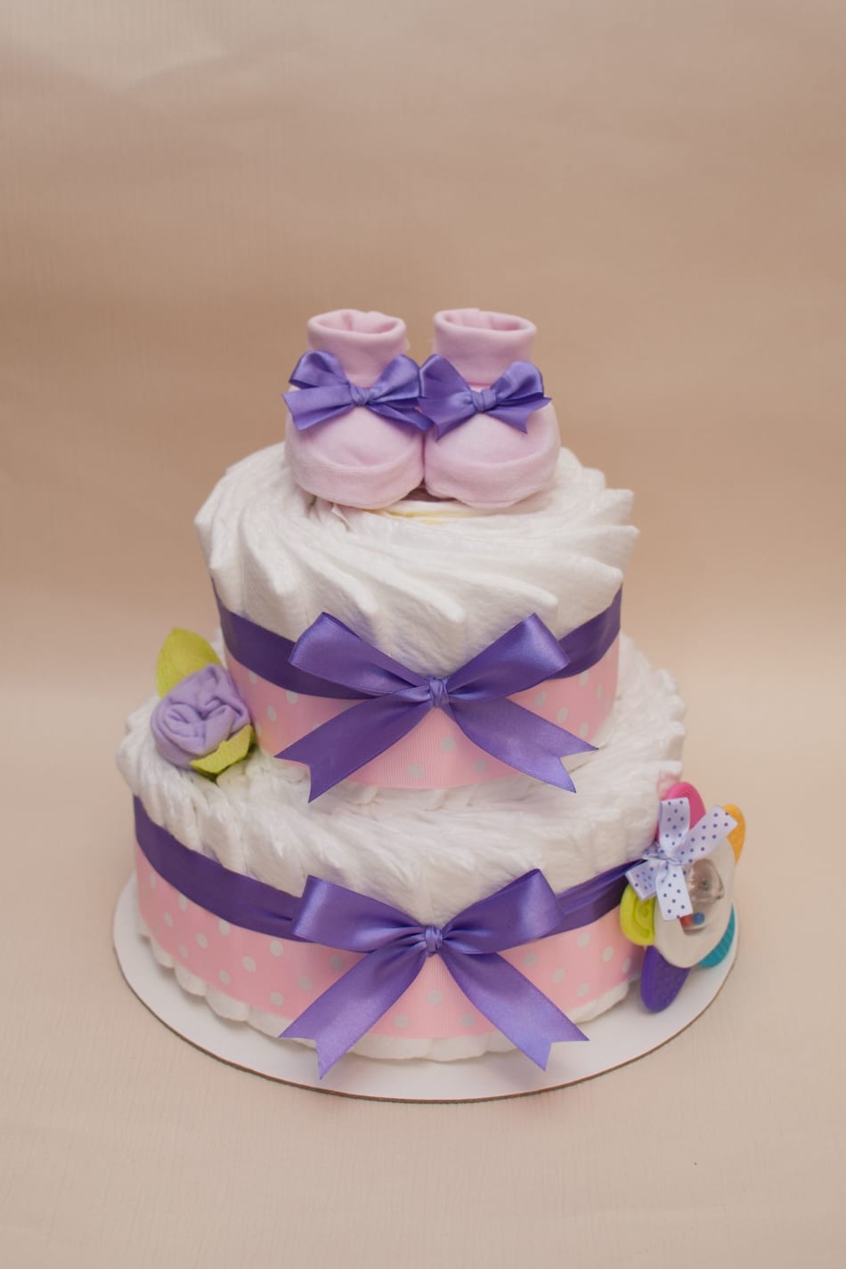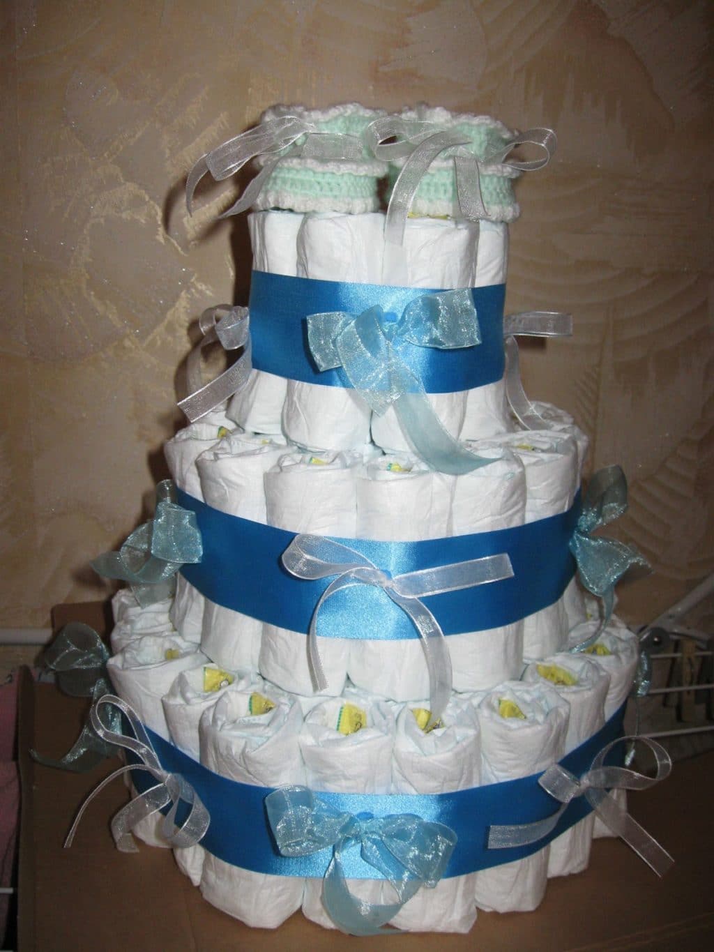 Do the same with the second tier and put them together. Wrap both tiers with a wide ribbon, as if putting them on the diapers on top, and then tie each tier with ribbon for wrapping gifts. In the middle of each tier, you should tie a bow as in the photo. Put booties on the very top of the cake, decorate them with bows from the packing tape, fixing it on the booties using double-sided tape. Also put on the first and second tiers of socks, or what you consider necessary to give the baby.