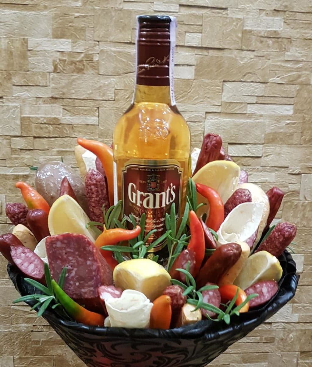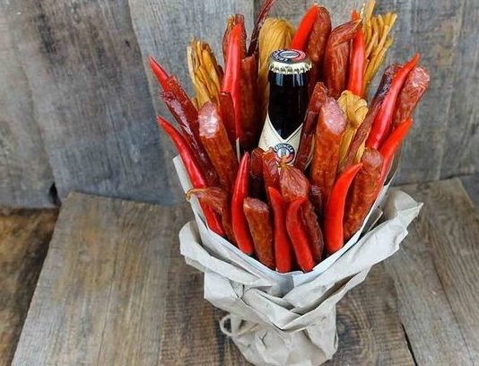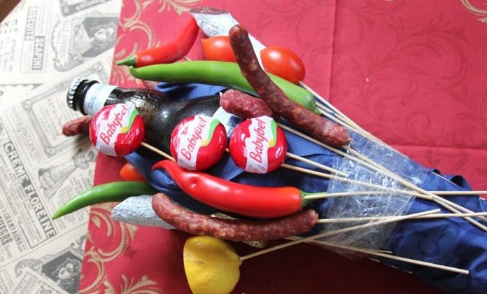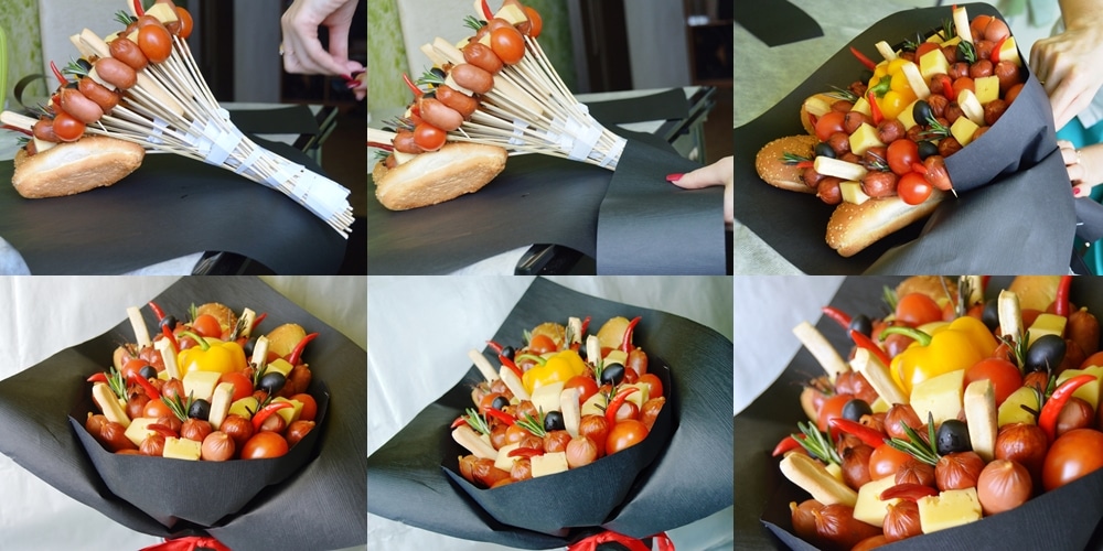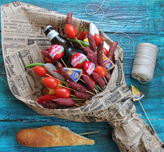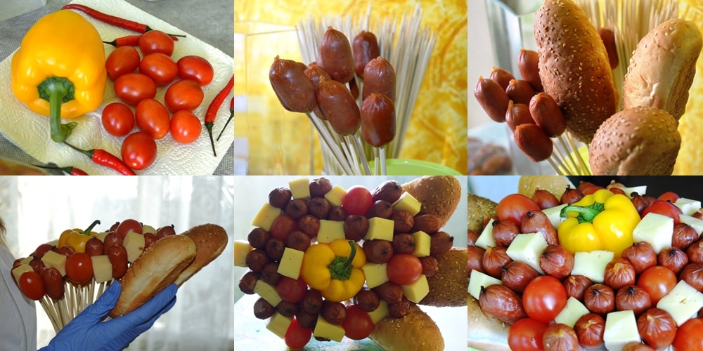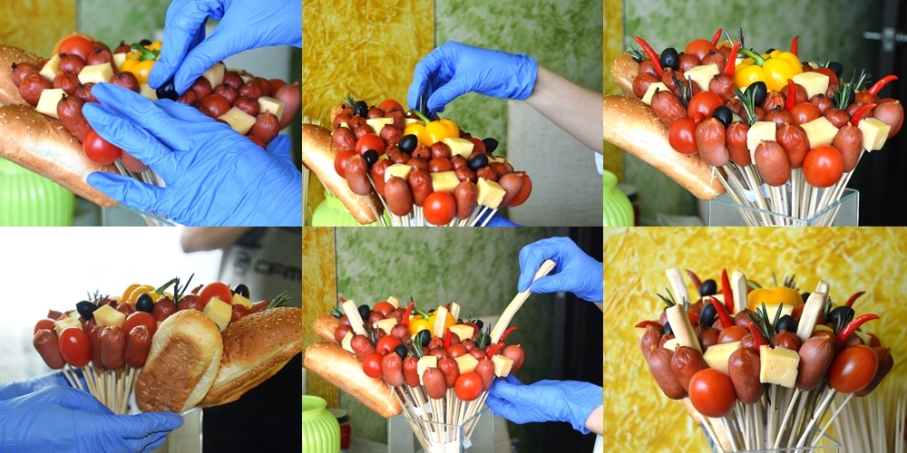 A very simple bouquet, the formation of which will not take you much time. First, rinse all the vegetables well, and cut the cheese into large pieces. After using wooden skewers, string on them vegetables, cheese, sausages and baguette.