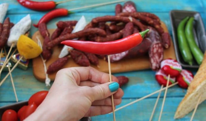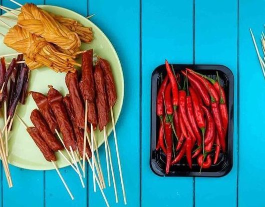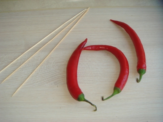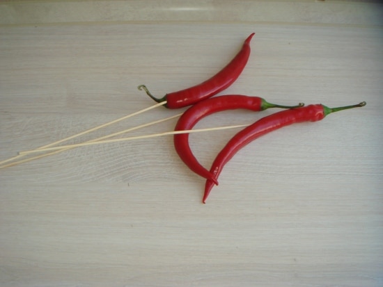 We do the same with chili peppers, piercing each along and only one across. We string cheese on a skewer.