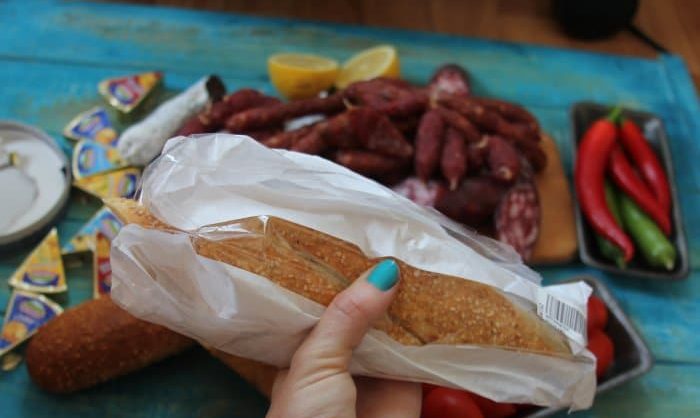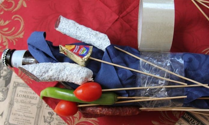 First, cut the sausage into three or four parts. After we cut the lemon in half and cut the baguette. In a napkin, preferably of dense quality, we wrap our beer bottle. We attach wooden skewers to the napkin itself using tape. After we string our sausage and sausages on skewers.