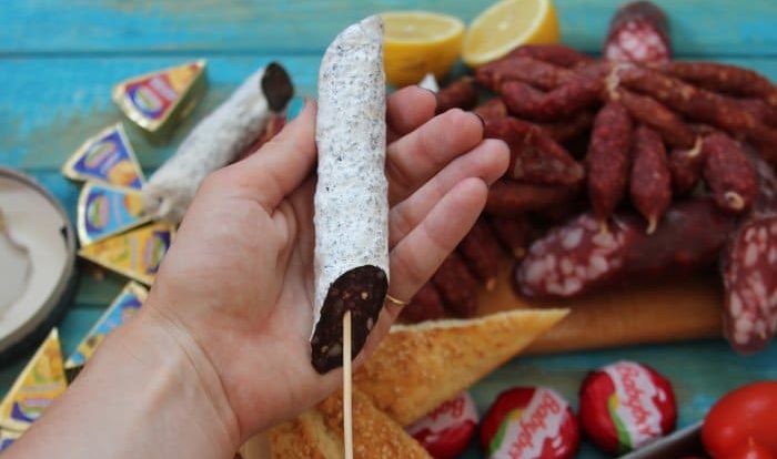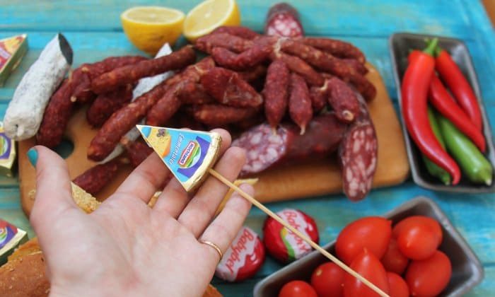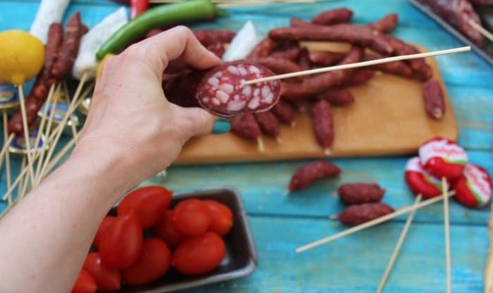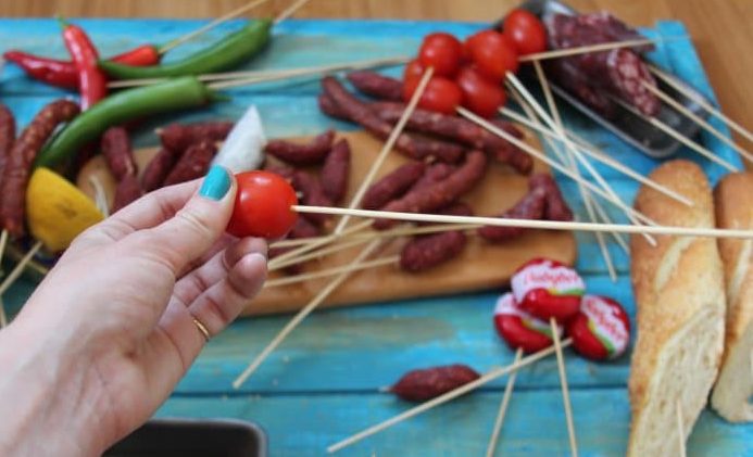 First, we cut the sausages in half, divide the cheese into pieces, and then we string all our elements on wooden skewers.