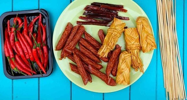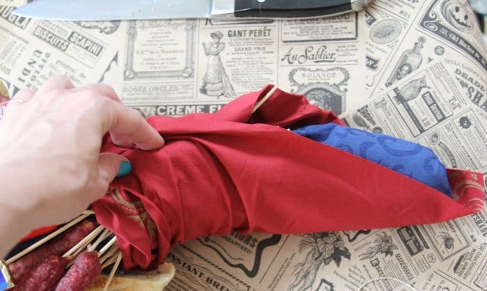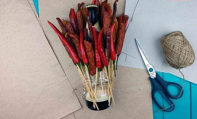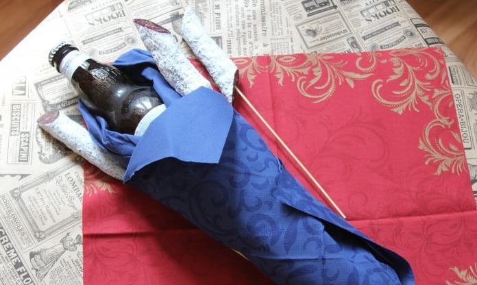 After wrapping the wrapped bottle with beer, another napkin to hide the skewers on which the sausage is strung.