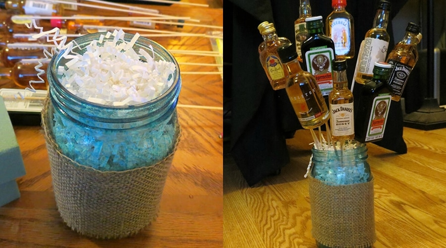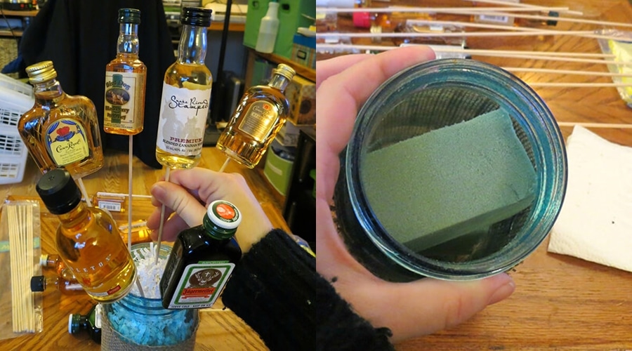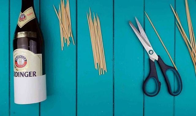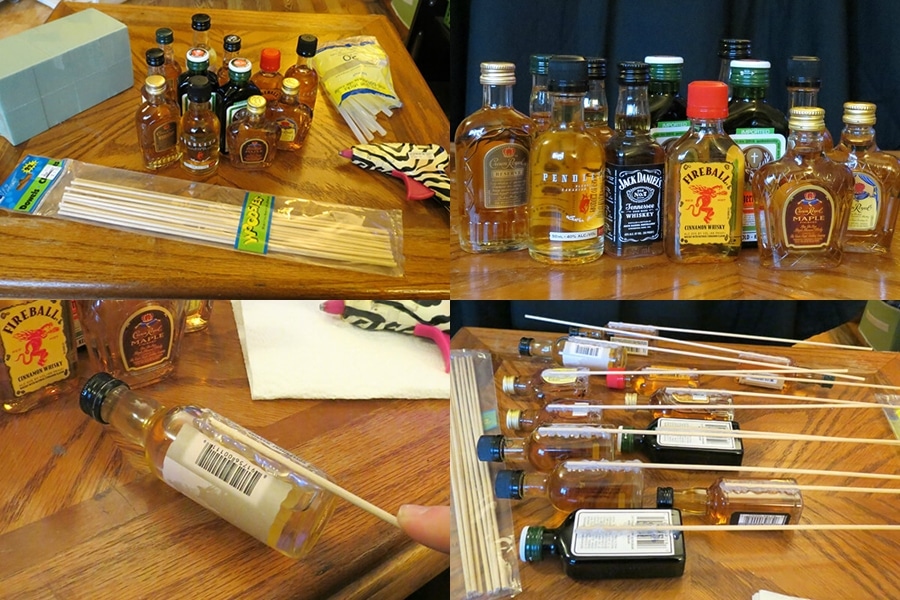 Each bottle of alcohol should be fixed on a wooden skewer with a glue gun. For reliability, you can wrap both the bottle and the skewer itself with thin tape.