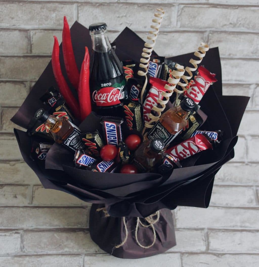 Fold your bouquet in any vase to make it more convenient to form a bouquet. Decorate it by inserting bread sticks and greens between skewers. After we tie the free legs of wooden skewers with tape and pack the bouquet in wrapping paper. We dress the bouquet at the base with a beautiful ribbon and the bouquet is ready.