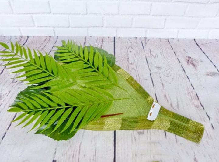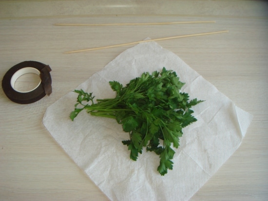 We decorate the bouquet with the help of greenery, fixing it as indicated in the photo using a heat tape.