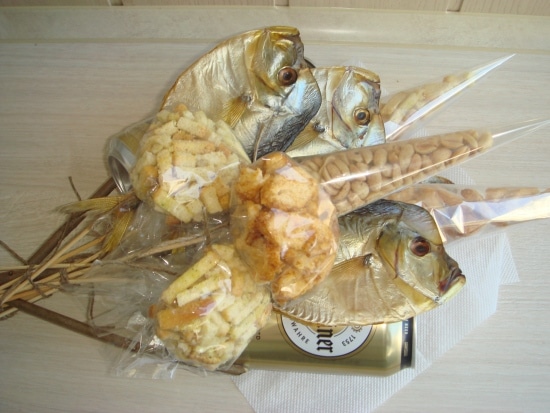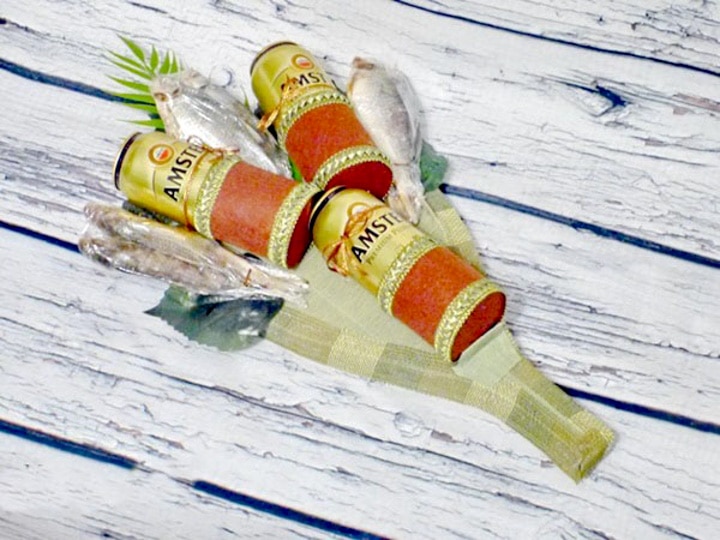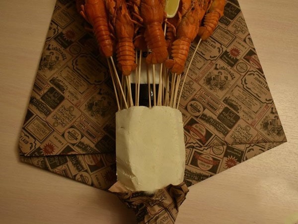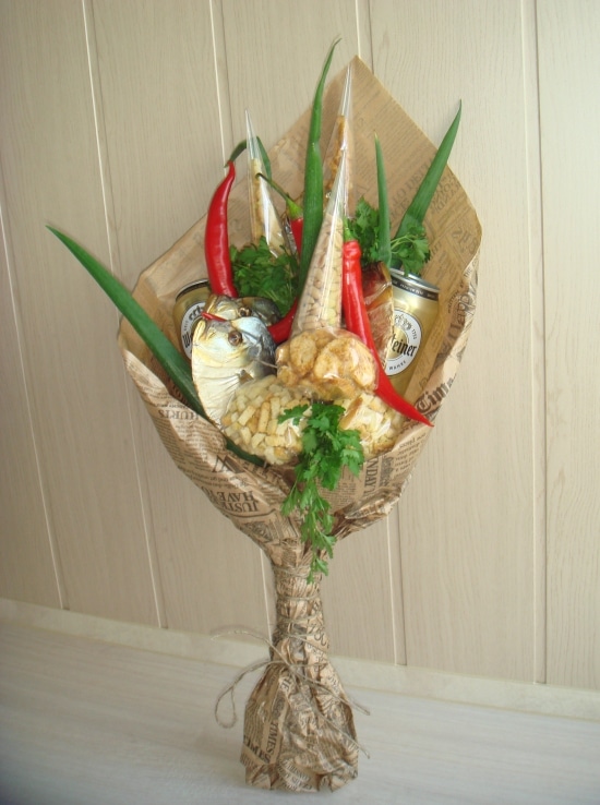 To attach the cans to the base firmly, it is worth wrapping each of them on the bottom with paper. After that, glue the same paper to the base of the bouquet with glue. We arrange beer cans in our bouquet, as indicated in the photo, and between them we spread our fish, previously wrapped with cling film. The film itself is a little worth gluing with glue, and stick it to the base of the bouquet.