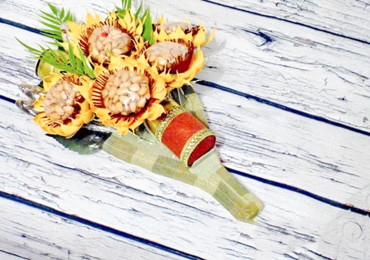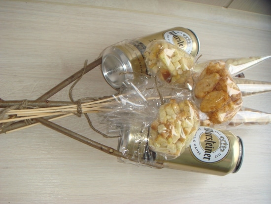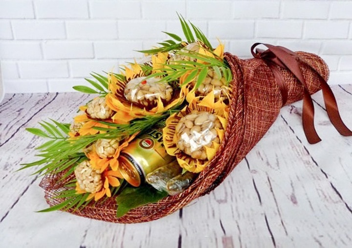 Pistachios and peanuts pour into cling film, do something like round circles and put on round pieces cut from yellow paper. Cut and tear the edges of the paper like flower petals. Glue the bag of nuts themselves to the base of the flower, and the flower itself to the base of the bouquet or a can of beer.
