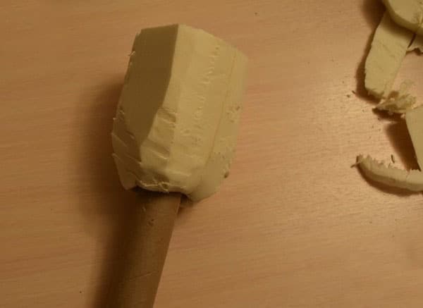To make a strong base, we need a foam and a cardboard tube. We do the necessary manipulations as indicated in the photo, and wrap the cardboard handle with wrapping paper.