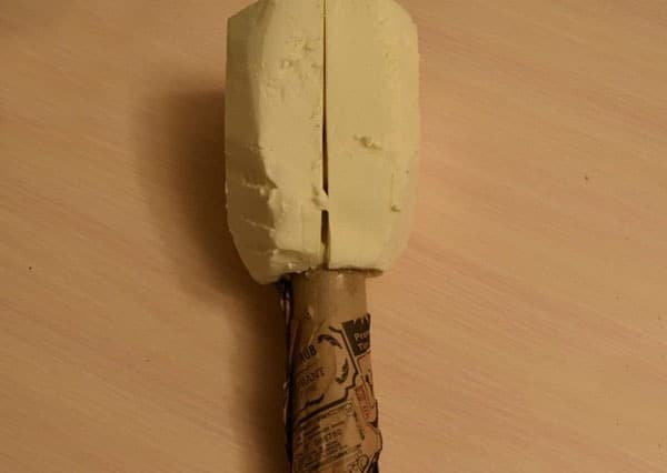 We put half of the baguette to the bottom of the bottle and, using brown paper and twine, fasten them together. We get something like a pen.