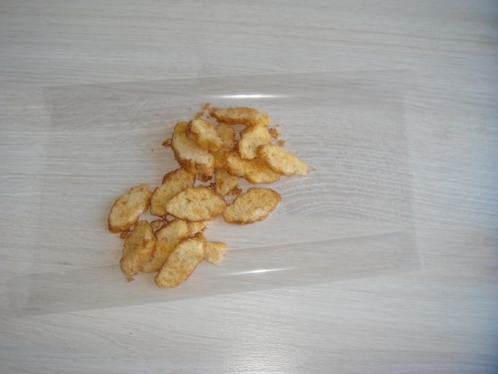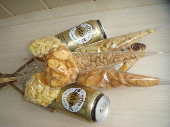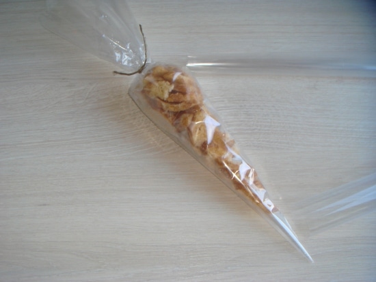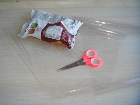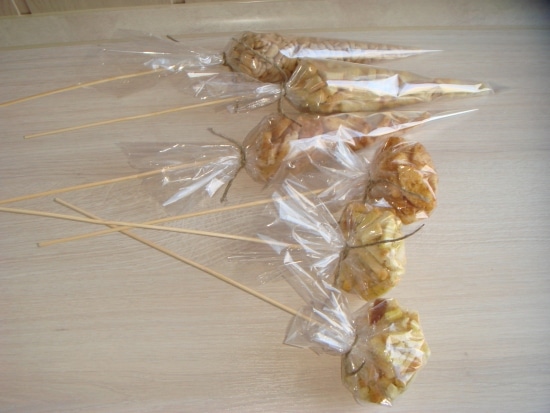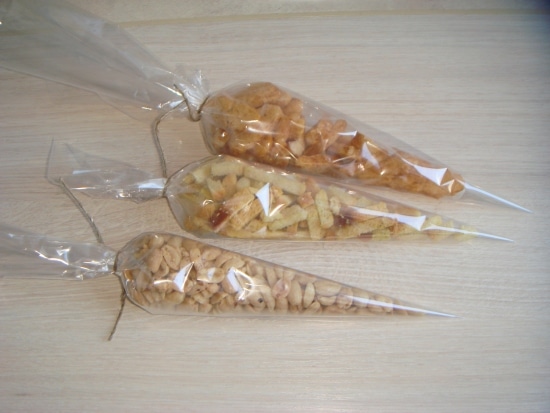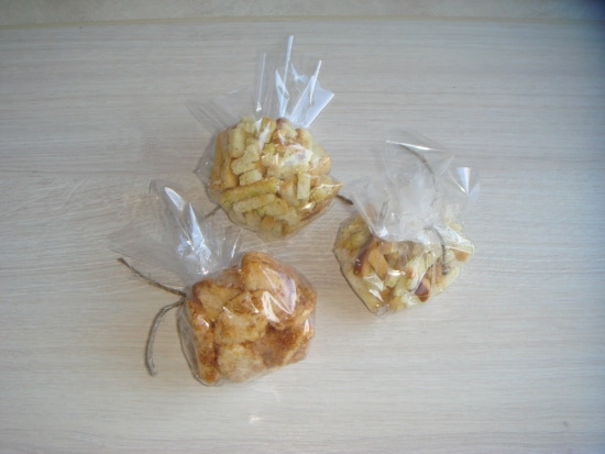 Crackers, peanuts or chips should be transferred from the original packs to packaging polyethylene. Cut the polyethylene into 20 * 20 squares and twist them, as indicated in the photo.