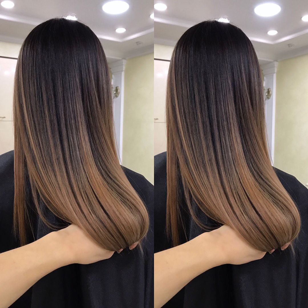 Often, girls get bored with a uniform dark hair color and more and more often the thought “Can it be brighter?” Slips through here. Since this staining does not affect the hair roots, it starts from the ear level. You can easily return to your previous color without much loss of hair quality.