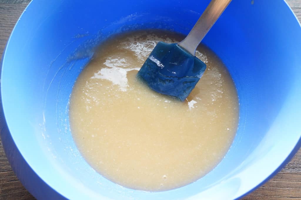- Then heat 100 ml of purified water in a saucepan and add sugar. Stir well and bring to a boil. Cook sugar until you cook a not very thick syrup. After ready, pour hot syrup into gelatin and with a mixer or blender beat the contents until light.