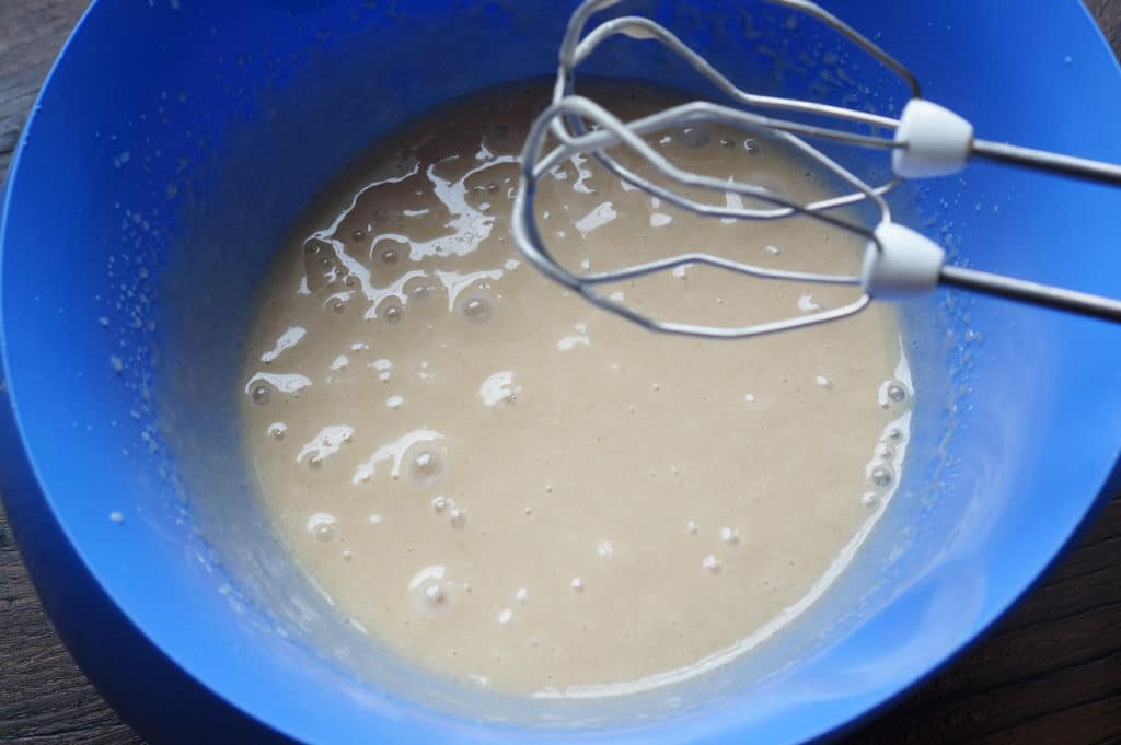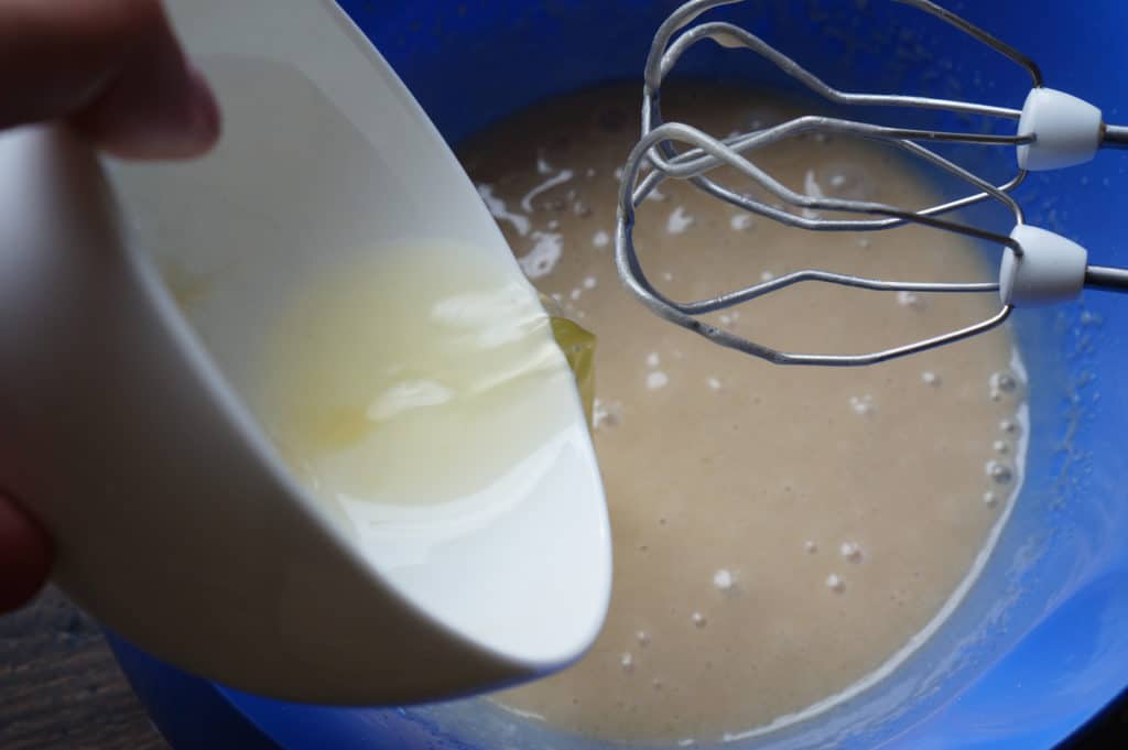 Add half the protein to the banana puree and beat well with a mixer. Then add the other half and continue whisking until the composition turns white and becomes more magnificent.
