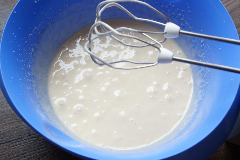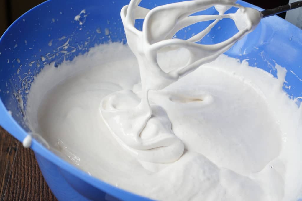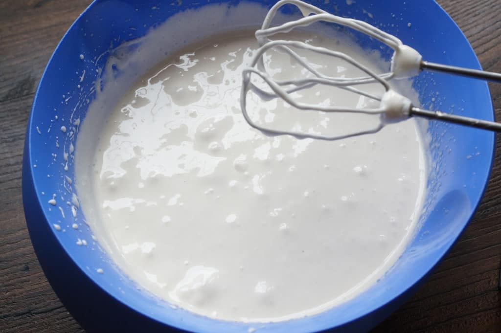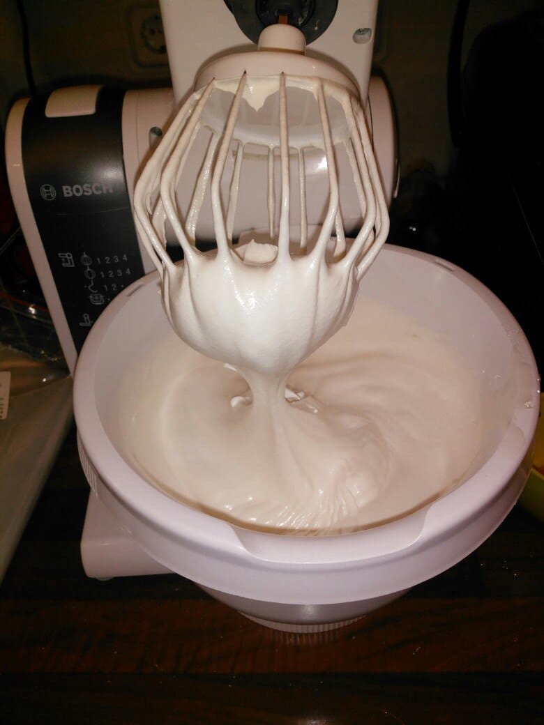 After very slowly, pour a thin stream of water with agar-agar. We begin to beat the mixture with the mixer at high speed until the mixture thickens as seen in the photo. Be sure to whip the mass precisely to such a state, otherwise, when the marshmallow is formed, the mass simply spreads.