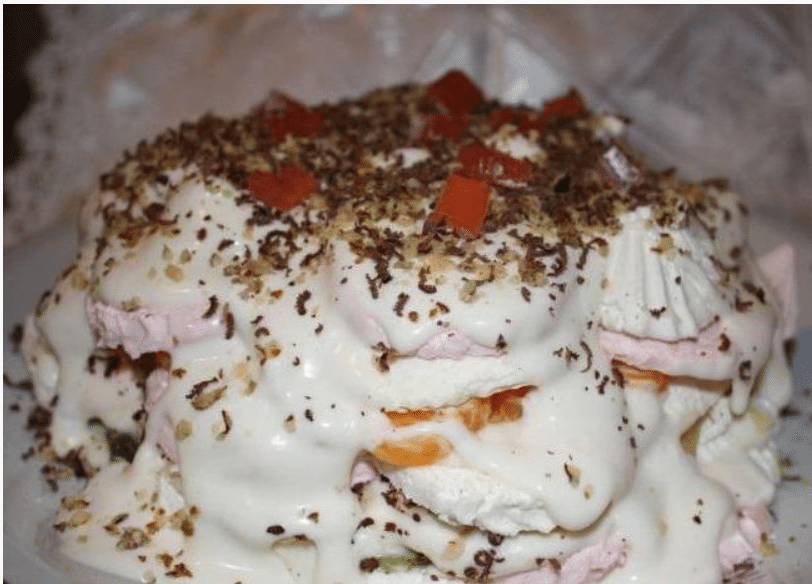 - Beat cream with a mixer until air foam appears. Put slices of marshmallows on a large dish and grease them with whipped cream. On top of them lay a layer of nuts, fruits and chocolate. Alternate layers until all ingredients are complete.