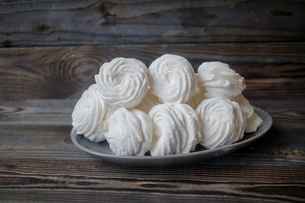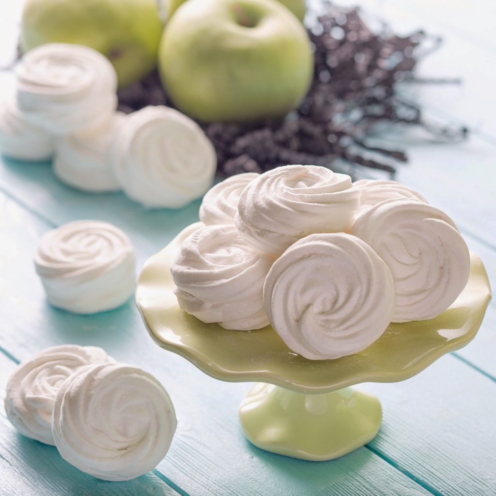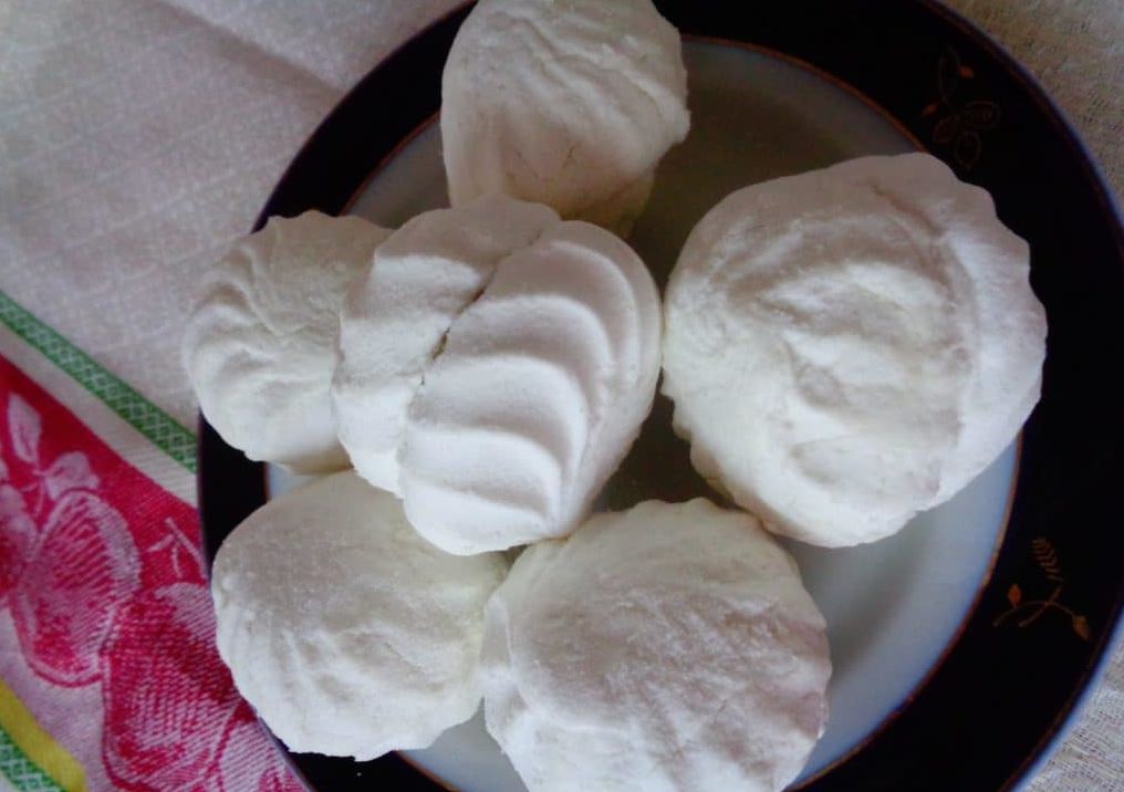 - Then add citric acid, vanillin and soda and beat for another five minutes. Then, using a culinary syringe and a special curly nozzle, take the mixture and squeeze it in small portions onto a baking sheet moistened with water. After the marshmallow has dried, combine it with the second half and roll in icing sugar.