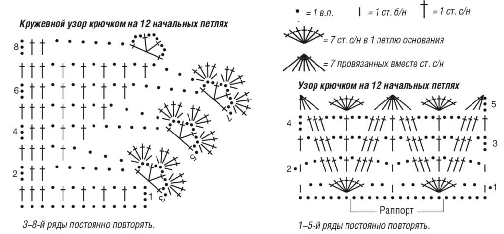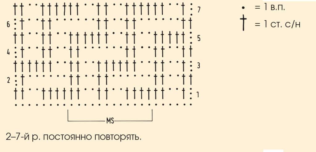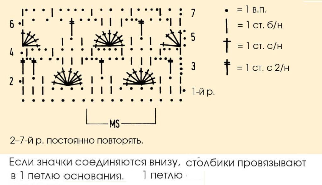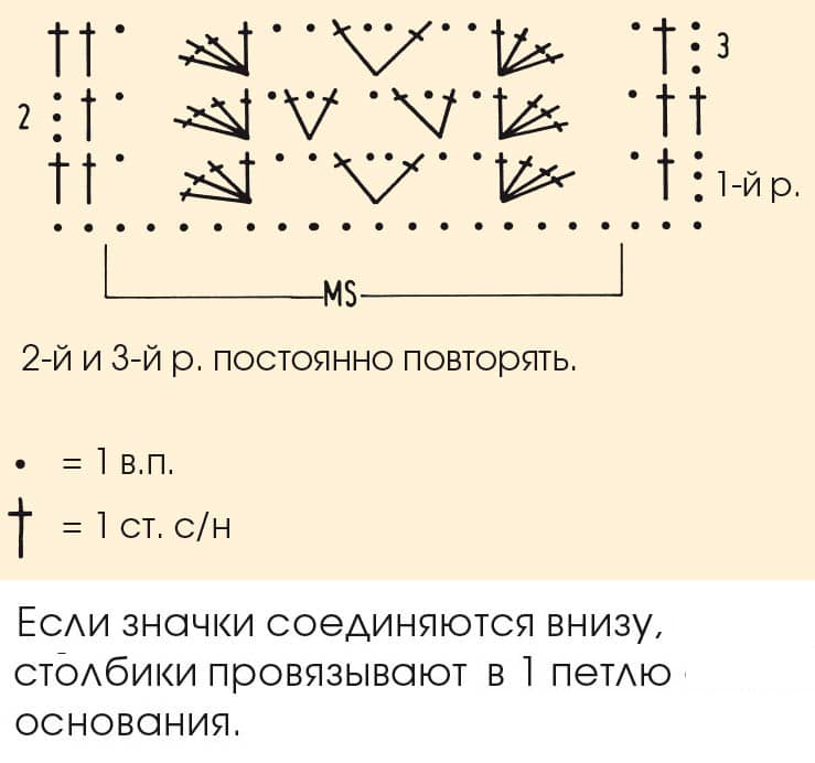 - You should expand all the work and start knitting vp (3 pieces - a string), an arch from v. p. (2 pieces) and s.n. (3 pieces), then vp (2 pieces), after sn. (3 pieces), after vp (3 pieces), in the arch of vp (2 pieces), then S.N. (3 pieces), after vp (2 pieces) and s.n. (3 pieces)