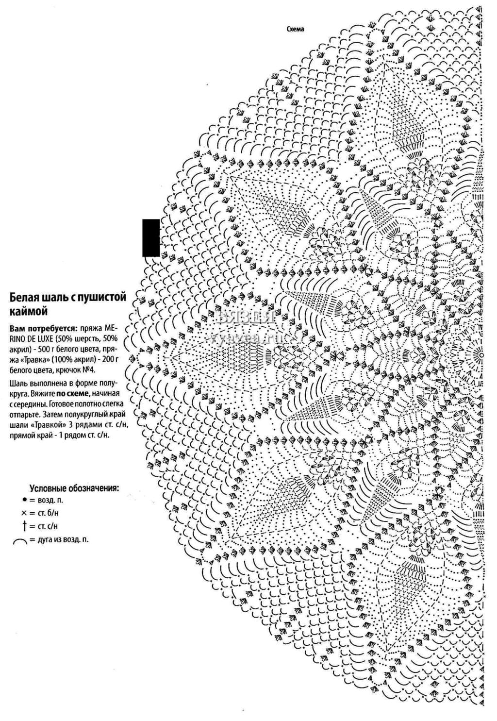 To knit a delicate, openwork work of art, you need a considerable amount of time, three skeins of snow-white yarn, as well as hooks under No. 3 or No. 5. In this shawl, such patterns will be used as: a chain of air loops, connecting posts, single crochet and crochet posts. Follow our scheme clearly and you will succeed.