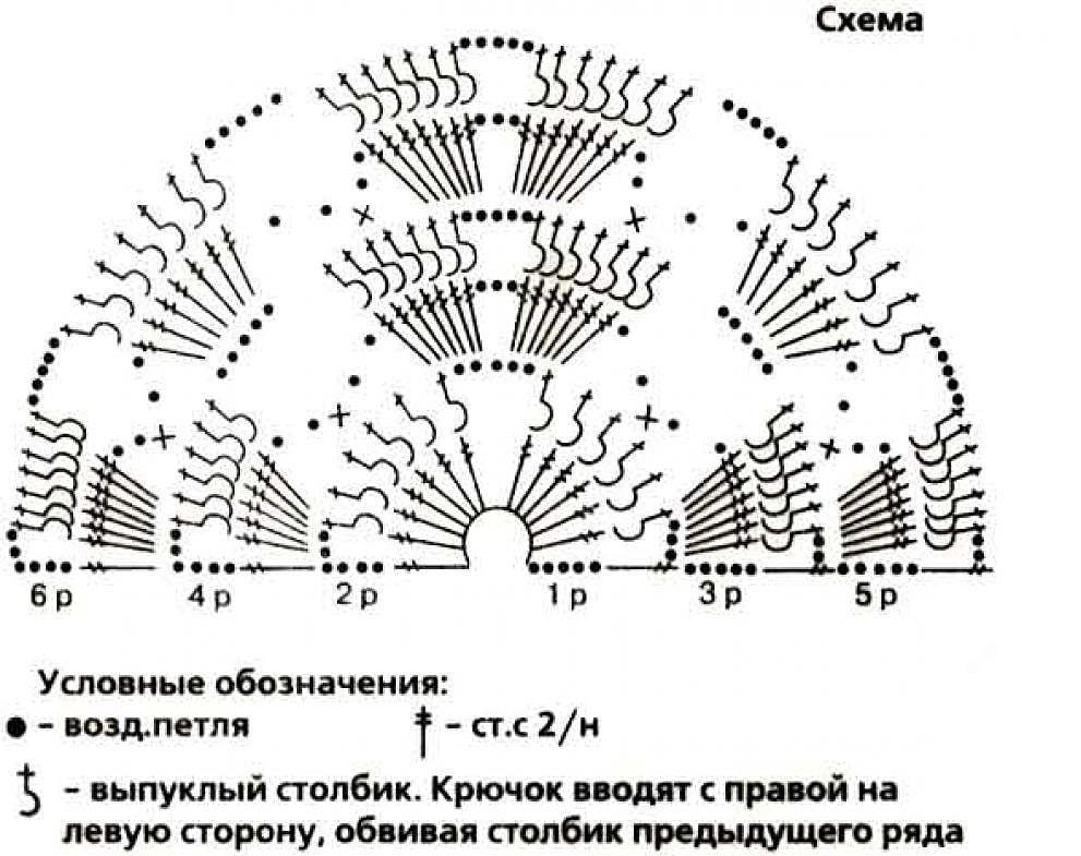 - Once again, we expand the work and do VP (3 pieces - a string), and into the arch from vp (2 pieces) we knit sn (3 pieces), after vp (2 pieces), then S.N. (3 pieces), after vp (4 pieces), after to the arch from vp (3 pieces), do with. (1 piece), then vp (4 pieces), after sec. (1 piece), v.p. (4 pieces), by the fan. Then on the central loops (3 pieces) according to s. (1 each), after vp (4 pieces), then into the arch from vp (3 pieces) do with. (1 piece), after vp (4 pieces), then c. (1 piece), after vp (4 pieces), after to the arch from vp (2 pieces) do s.n. (3 pieces), v.p. (2 pieces), after sn. (3 pieces)