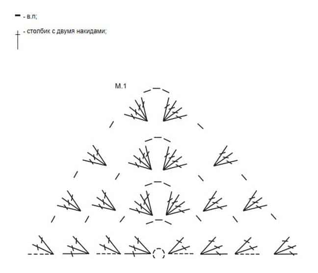 - On the sides of our future shawl, you need to make a series of columns with two crochets and rises of up to five loops.