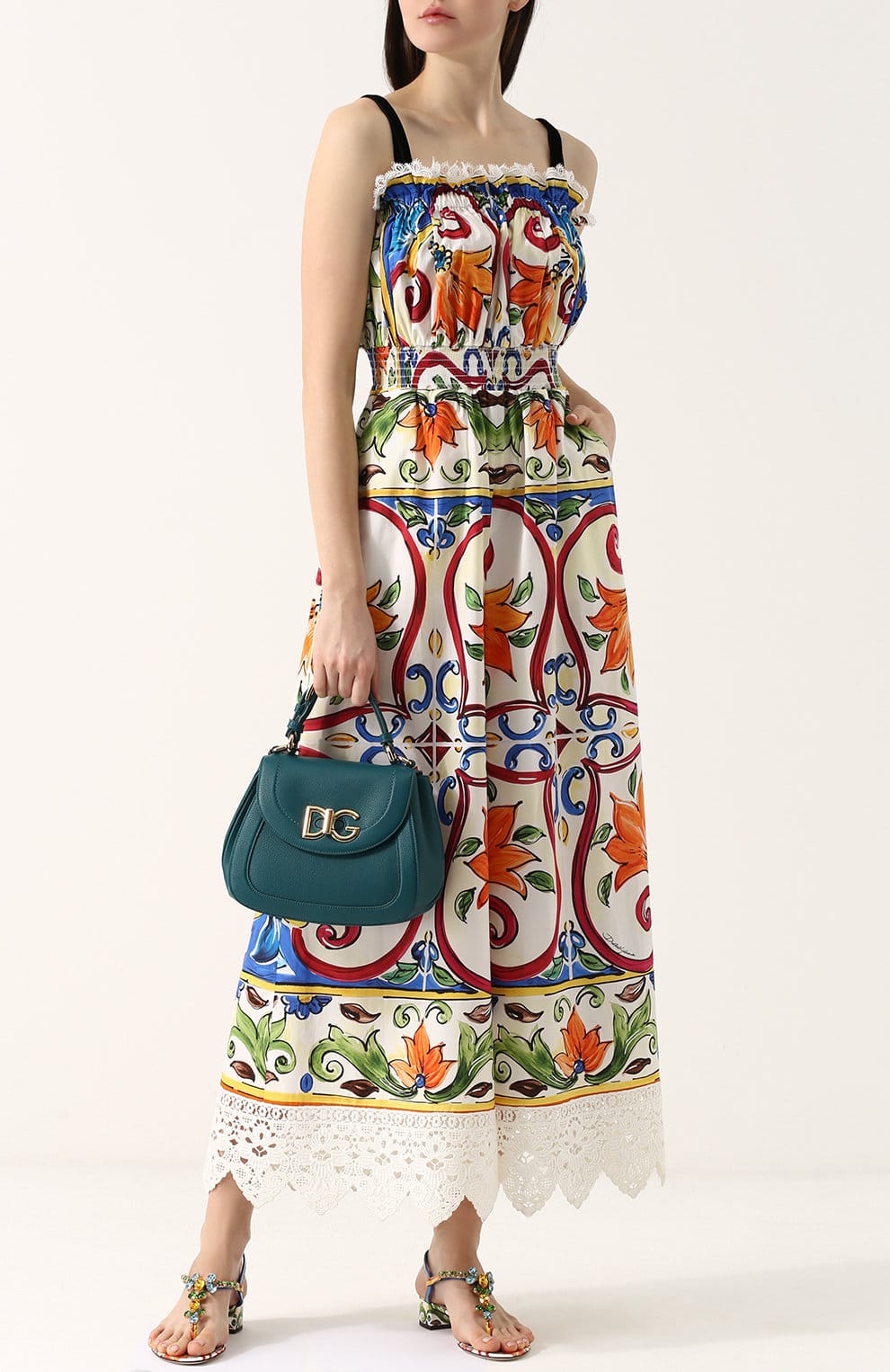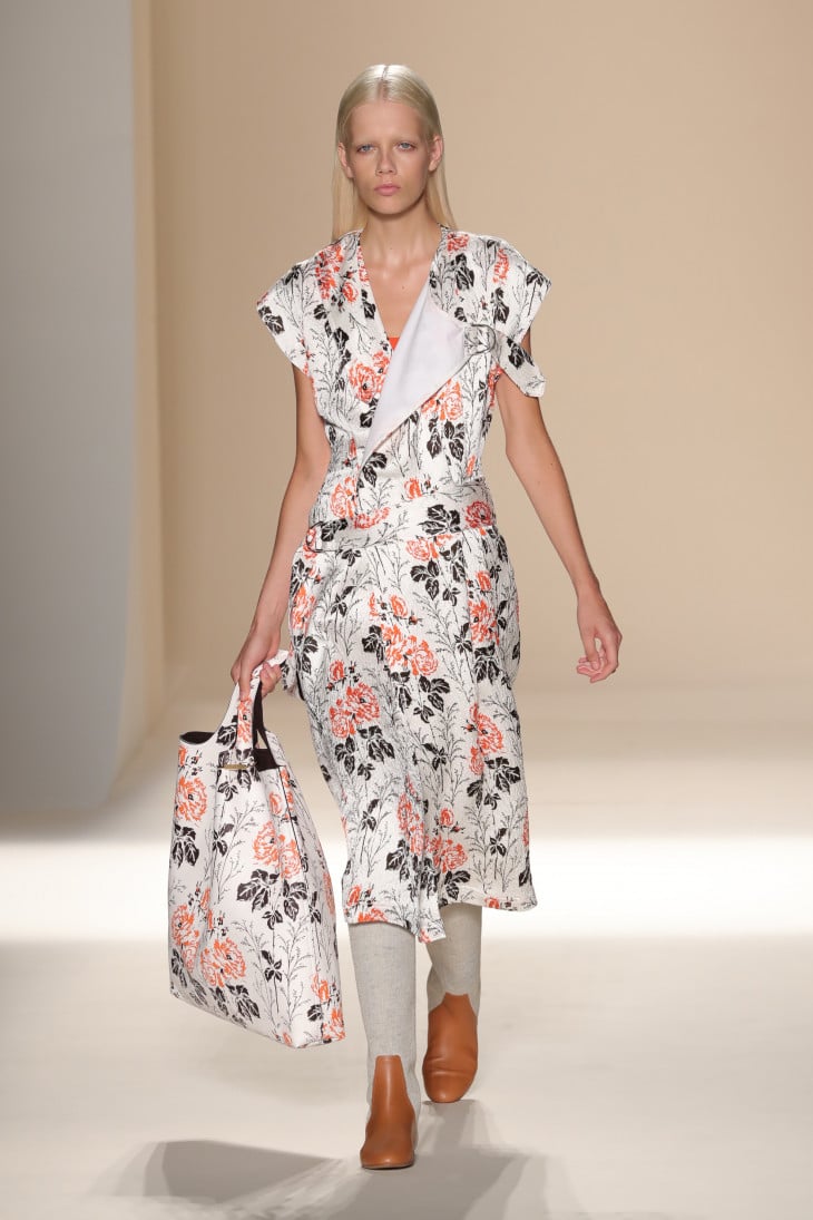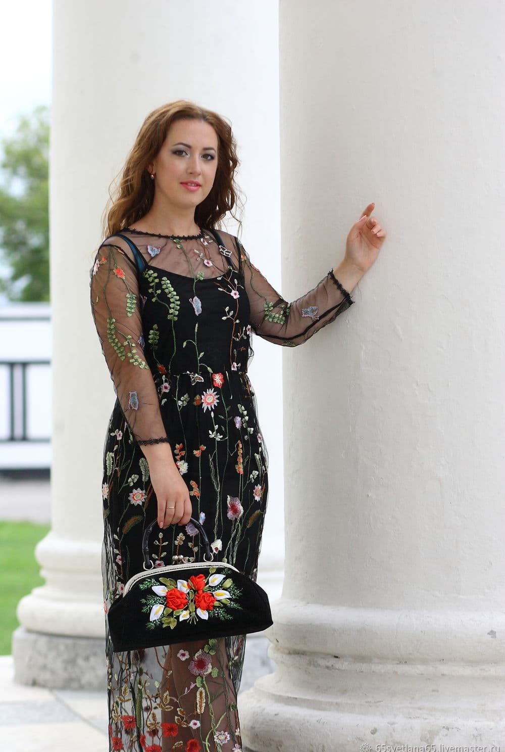 Also, there will be an original combination of a dress with a floral print, with a handbag of a similar theme.
