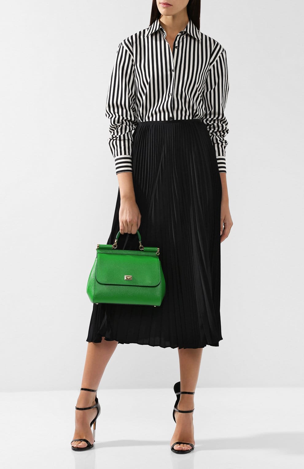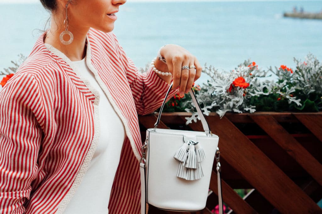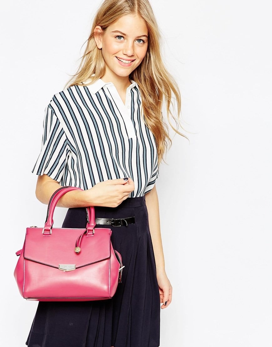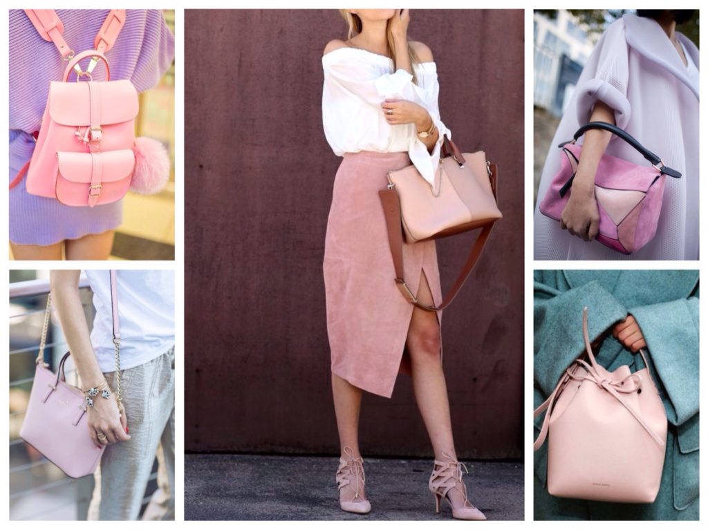 So, for example, a pink bag of medium size, goes well with a black skirt and a white striped blouse.