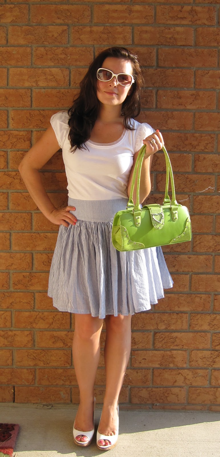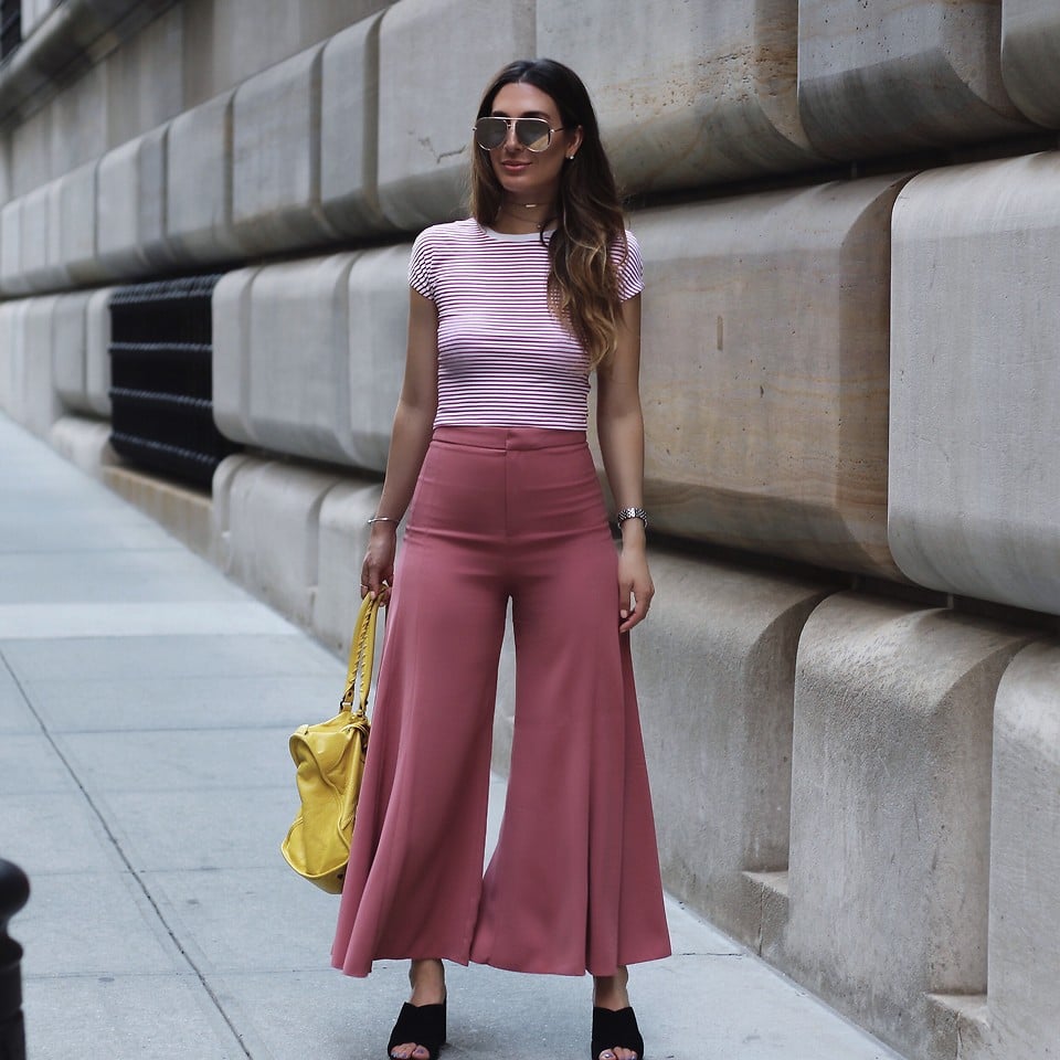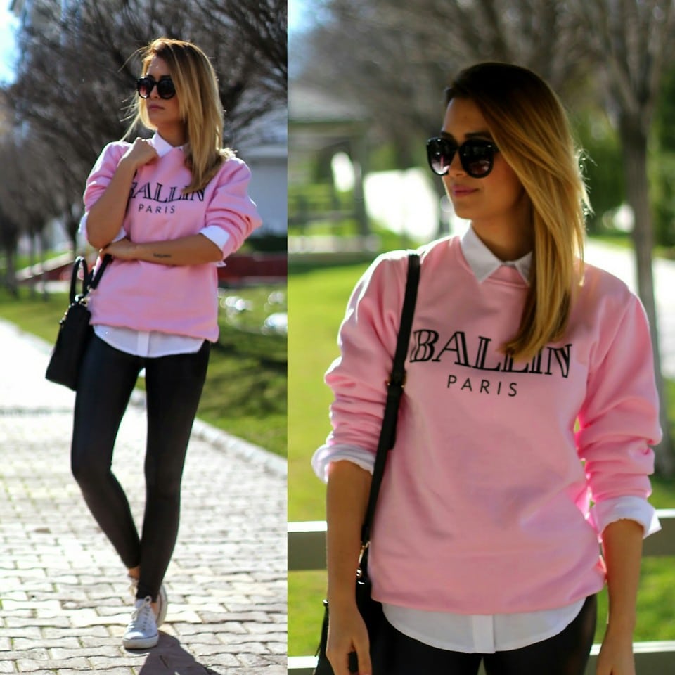 So, for example, a pink bag of medium size, goes well with a black skirt and a white striped blouse.