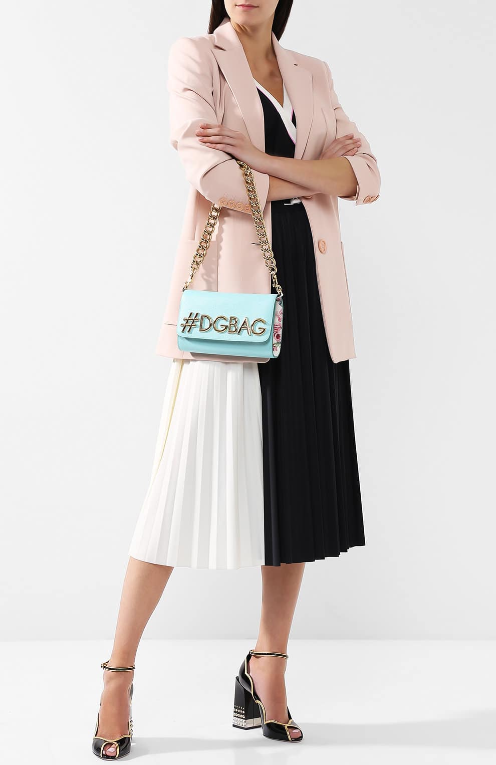 And we get an interesting combination by choosing a black and white dress and a small blue bag. And your image will be extraordinary, a jacket that is dressed on top of the dress will make it.