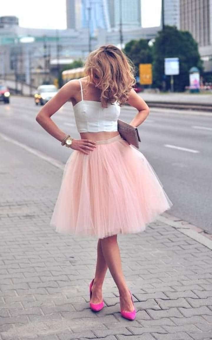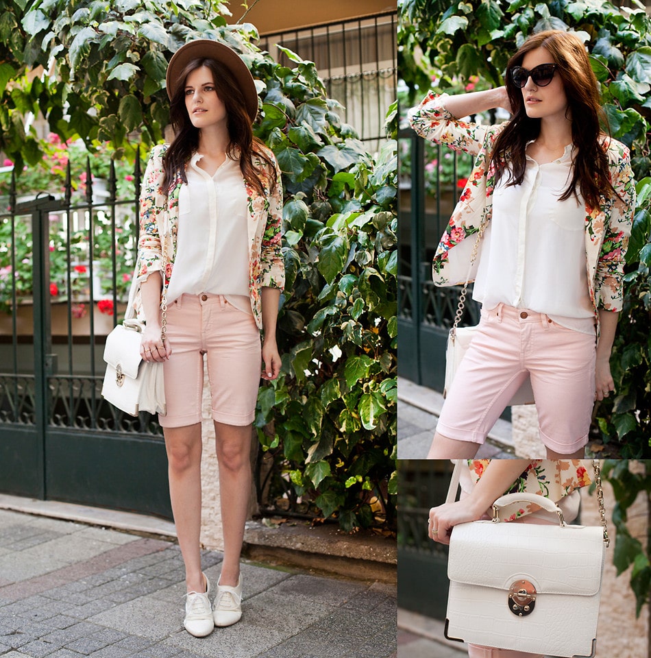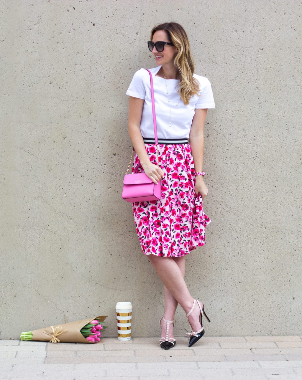Skirts of pink flowers with white blouses are perfectly combined with pink bags in a romantic look.