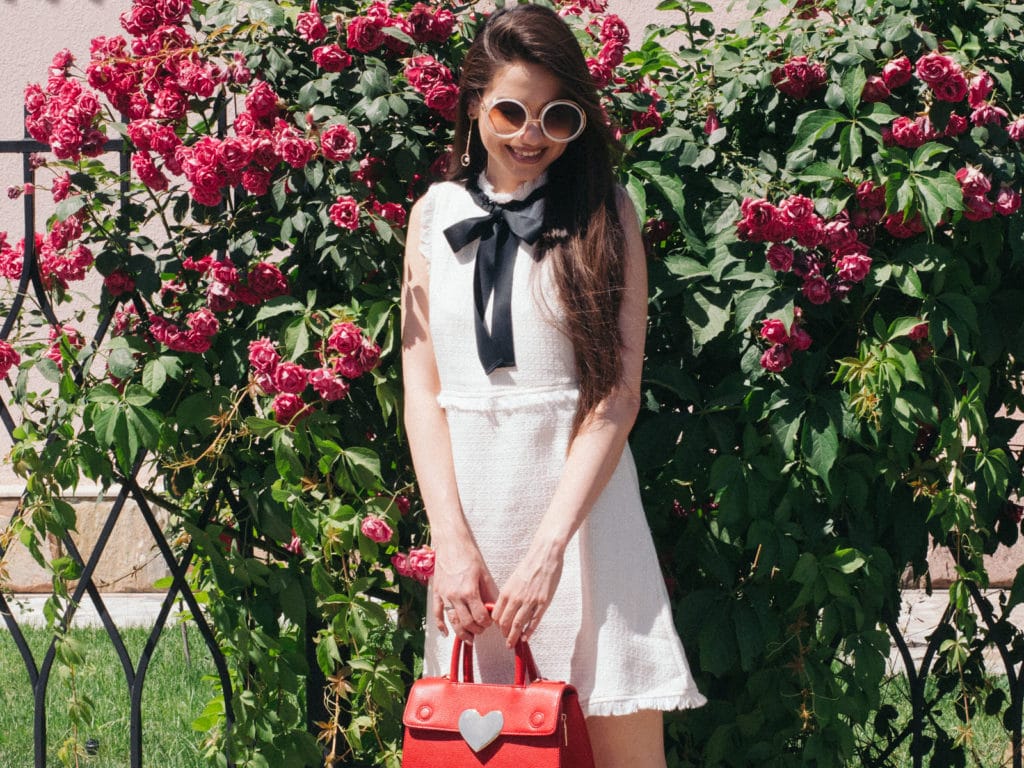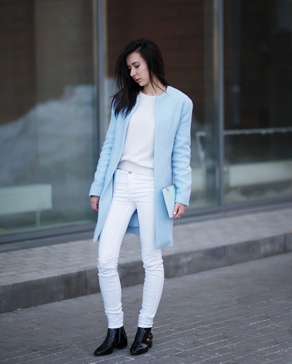 A small white handbag on the strap will look great with bright things, and it will also effectively complement the image of a pink coat or jacket. And your image will turn out easy and romantic.