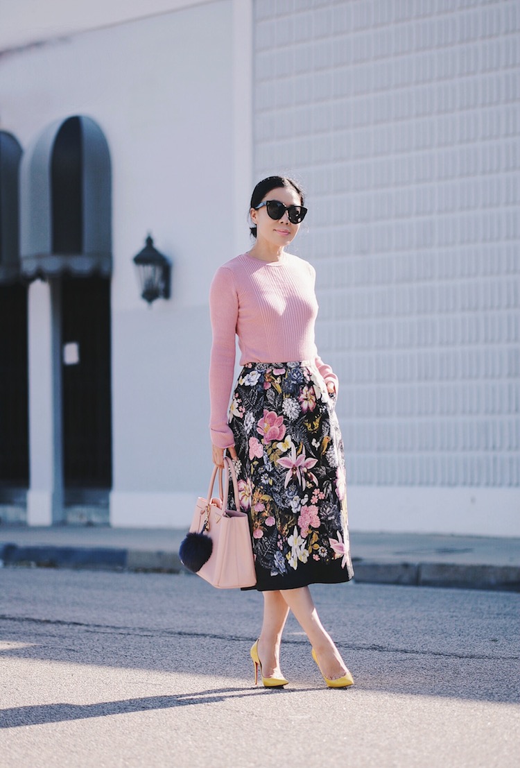 And also an interesting set of midi skirts with floral prints and pale pink sweaters, complete with yellow shoes and a pink bag.