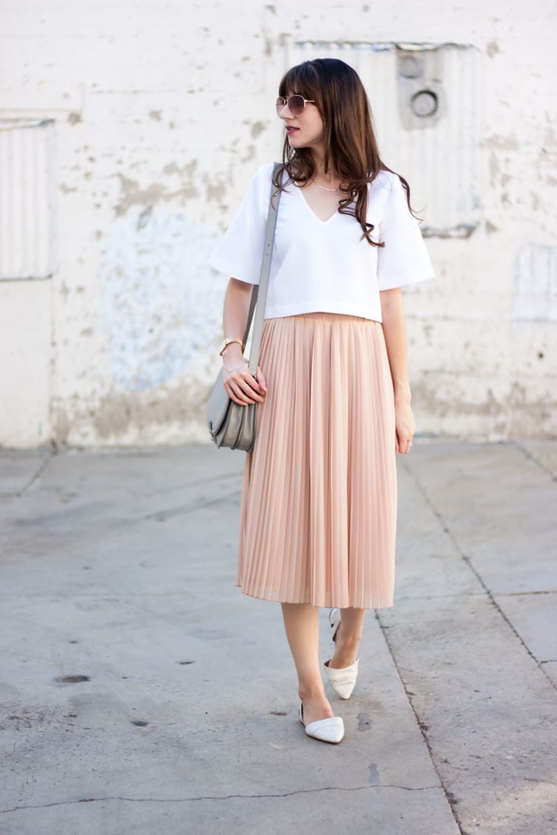 A gentle and laid-back design, it turns out by wearing a peach-colored midi skirt with a white T-shirt. Round off the look with a gray shoulder bag.