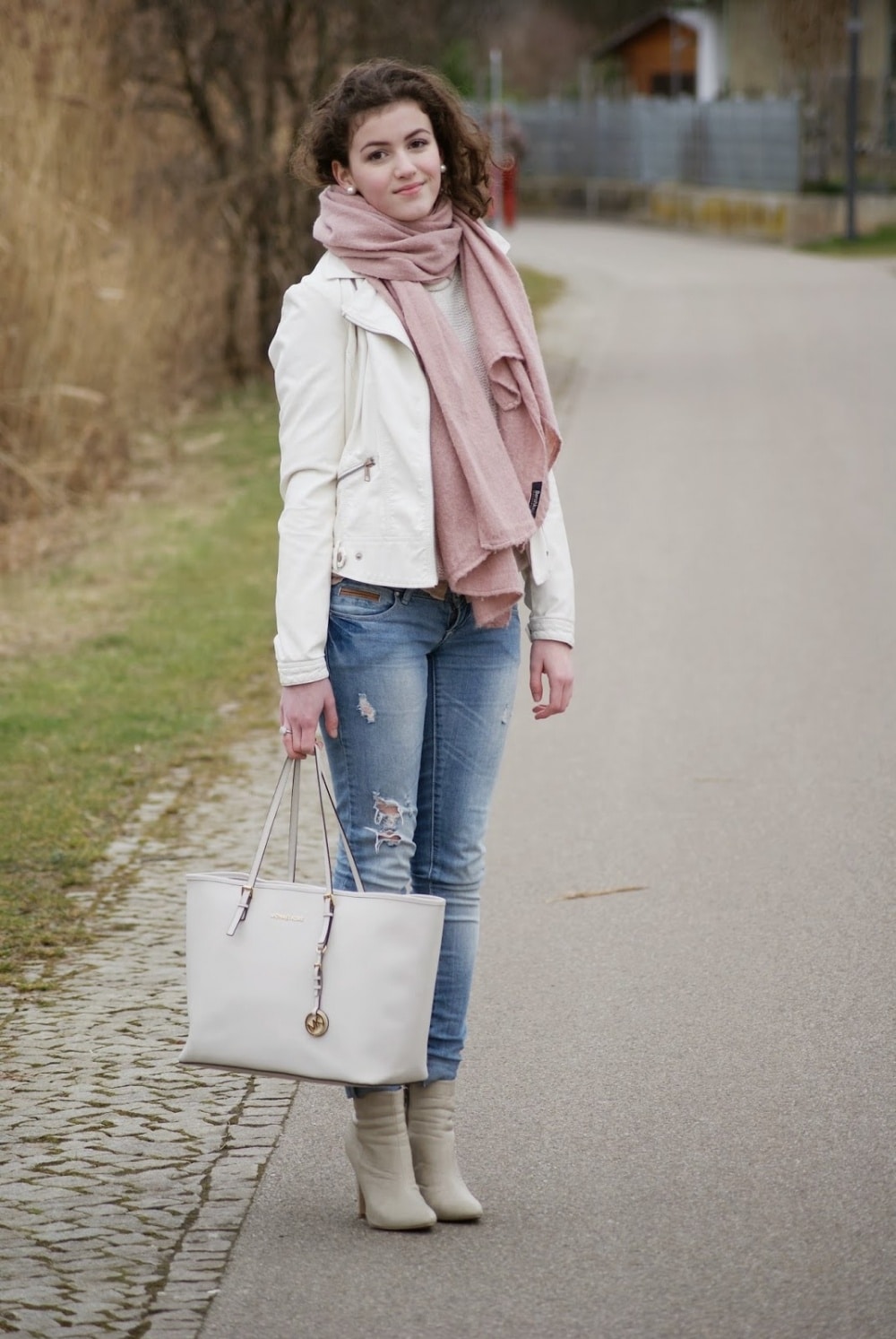 In a stylish youth kit with jeans and a jacket, a white large bag looks appropriate.