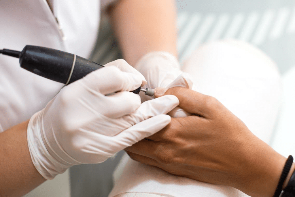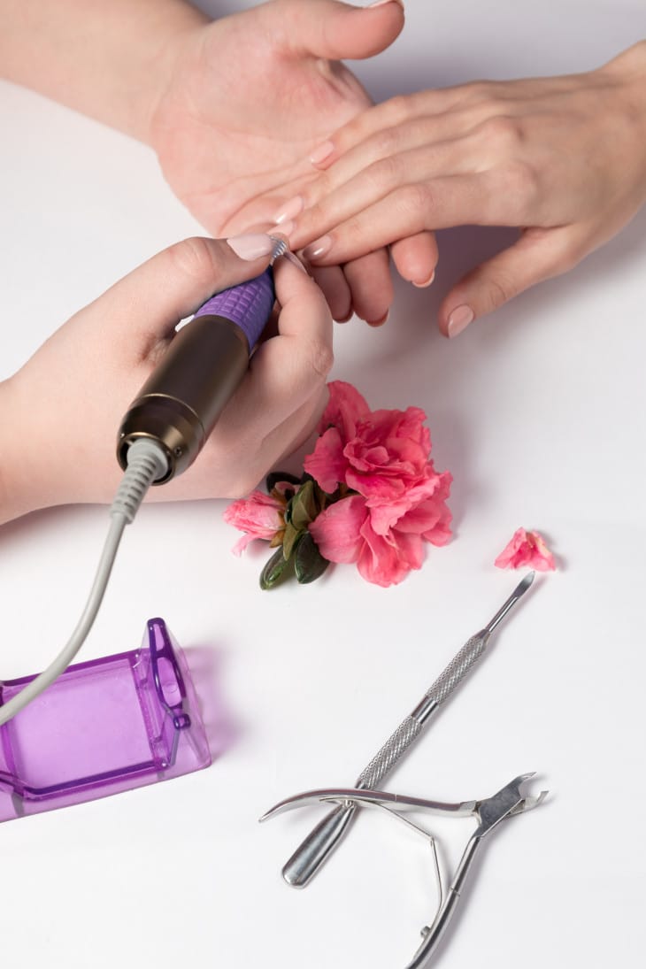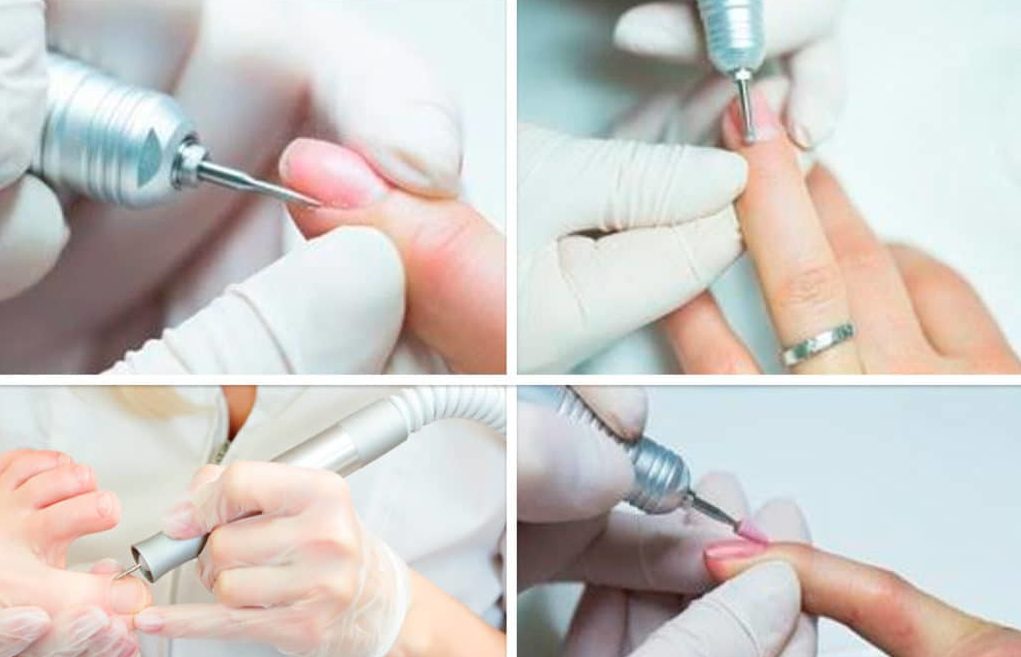 Then turn on the device and grind the nail rollers with a small, non-abrasive nozzle (hardware view of manicure)