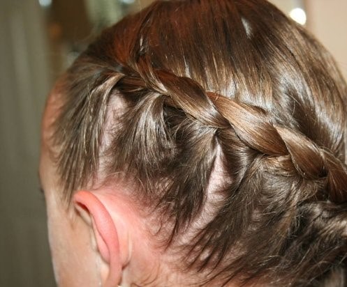 - Then we take a strand in the temporal part and begin to weave our braid, picking up the strands from below, and not from above.